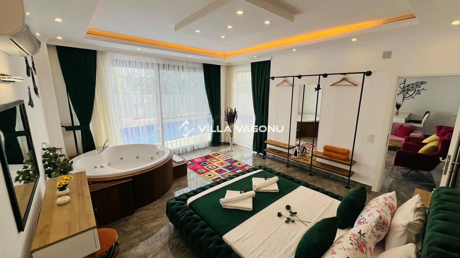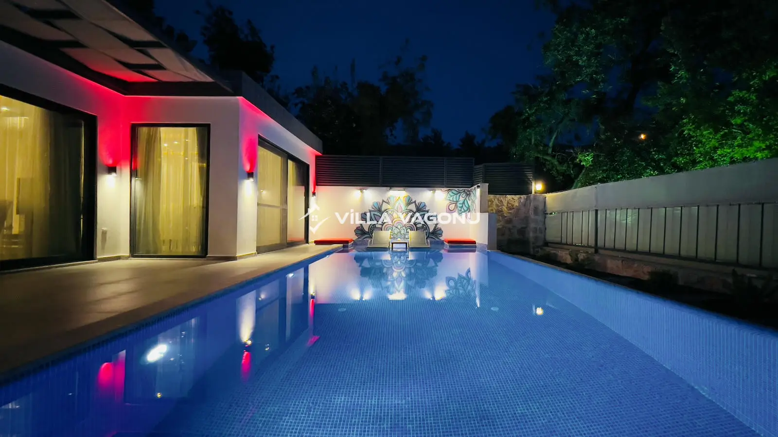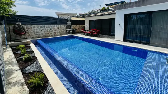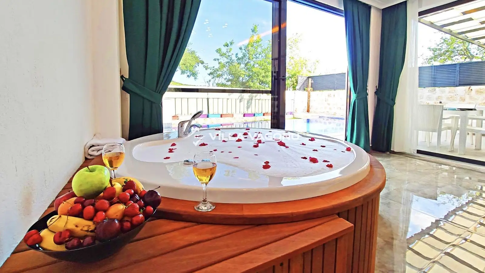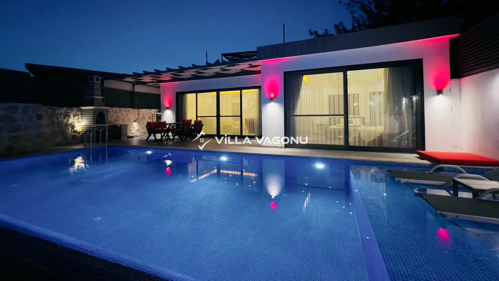 Tatlı ve hoş dekorasyonuyla sizleri karşılayan tatil evinin, havuz terasında kapasiteye uygun oturma alanı, şezlong takımı, barbekü; havuz terasına açılan konforlu oturma odası, ihtiyaçlarınızı karşılayacak donanımlı mutfağı bulunmaktadır. Bir yatak odasında çift kişilik yatak, ikinci yatak odasında da tek kişilik yatak bulunmaktadır. Ayrıca jakuzi de bulunan villada, konforlu bir tatil sizleri beklemektedir.