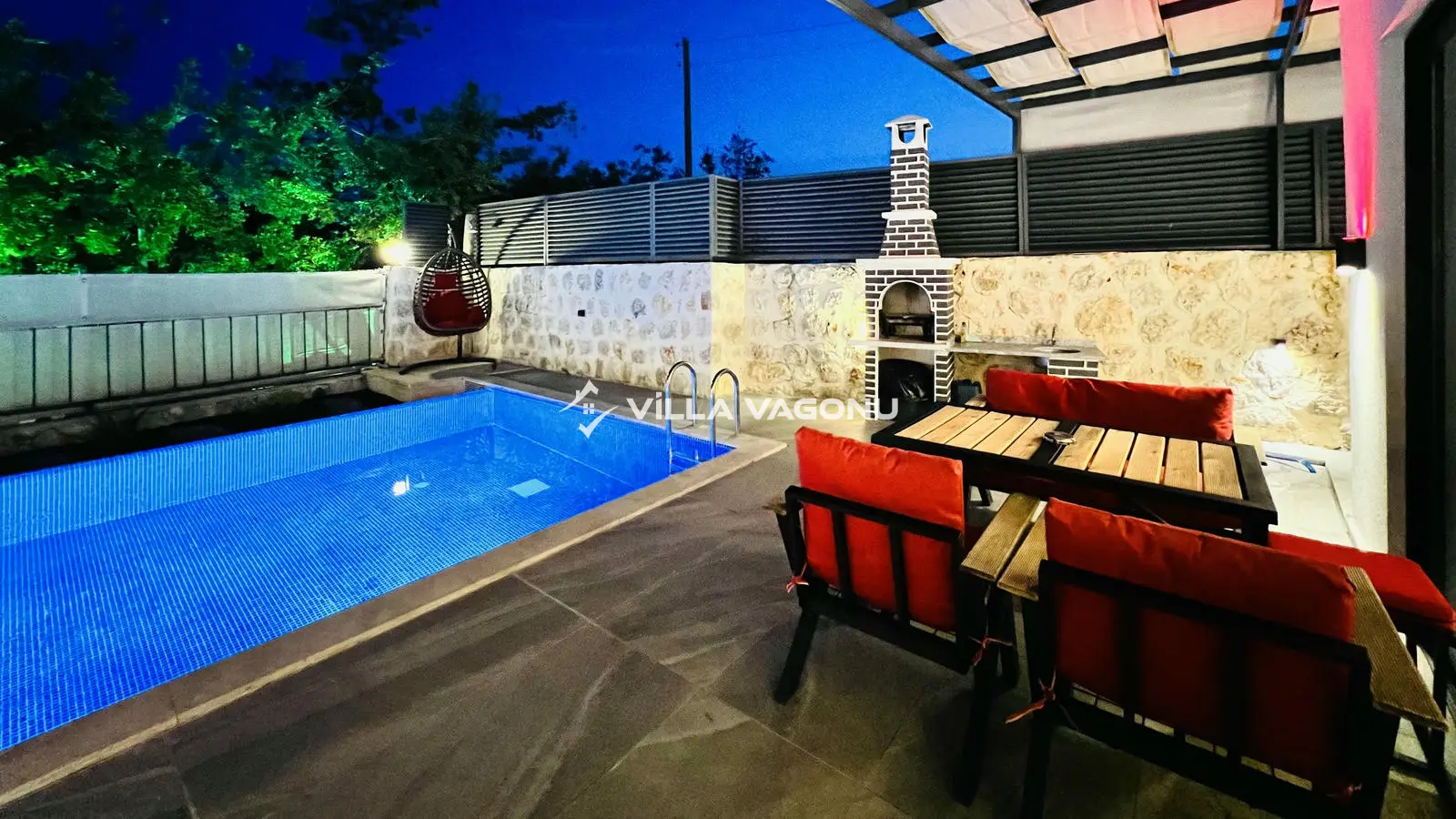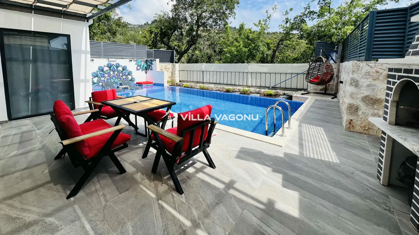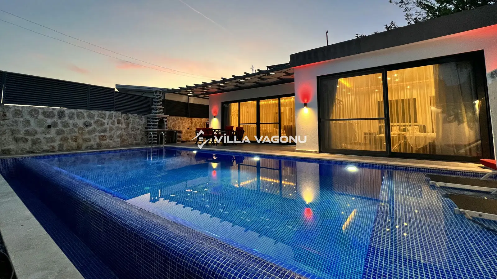 Tatlı ve hoş dekorasyonuyla sizleri karşılayan tatil evinin, havuz terasında kapasiteye uygun oturma alanı, şezlong takımı, barbekü; havuz terasına açılan konforlu oturma odası, ihtiyaçlarınızı karşılayacak donanımlı mutfağı bulunmaktadır. Bir yatak odasında çift kişilik yatak, ikinci yatak odasında da tek kişilik yatak bulunmaktadır. Ayrıca jakuzi de bulunan villada, konforlu bir tatil sizleri beklemektedir.