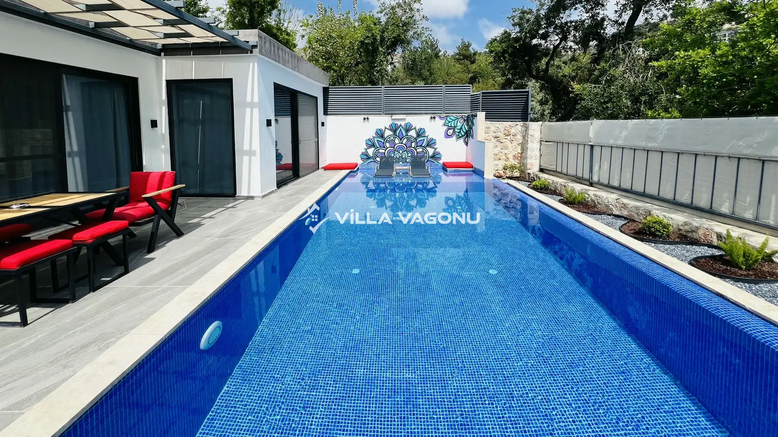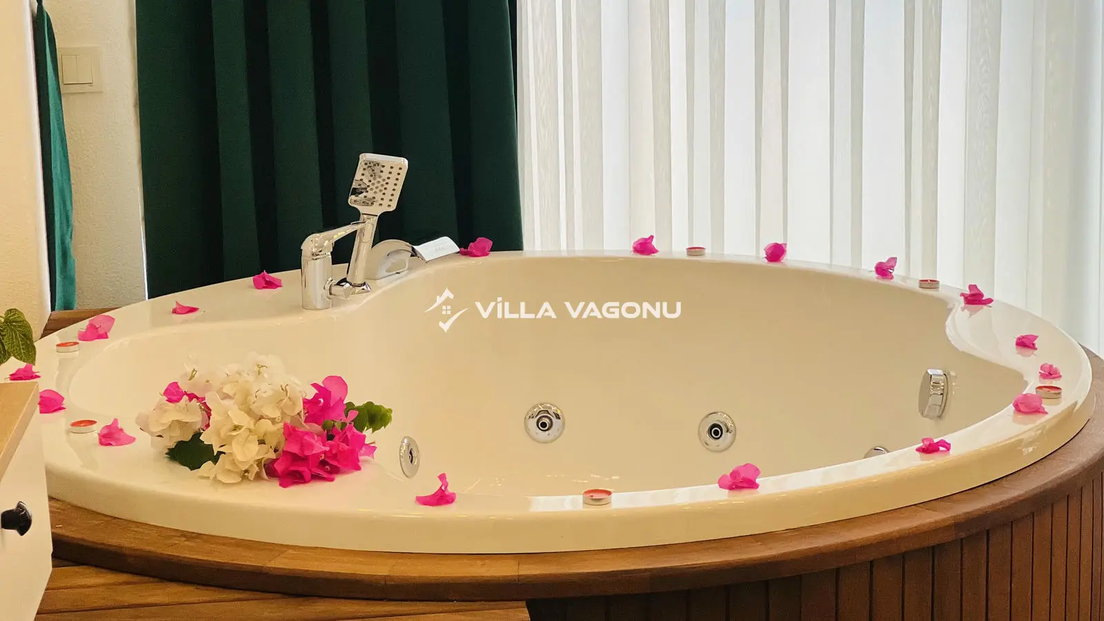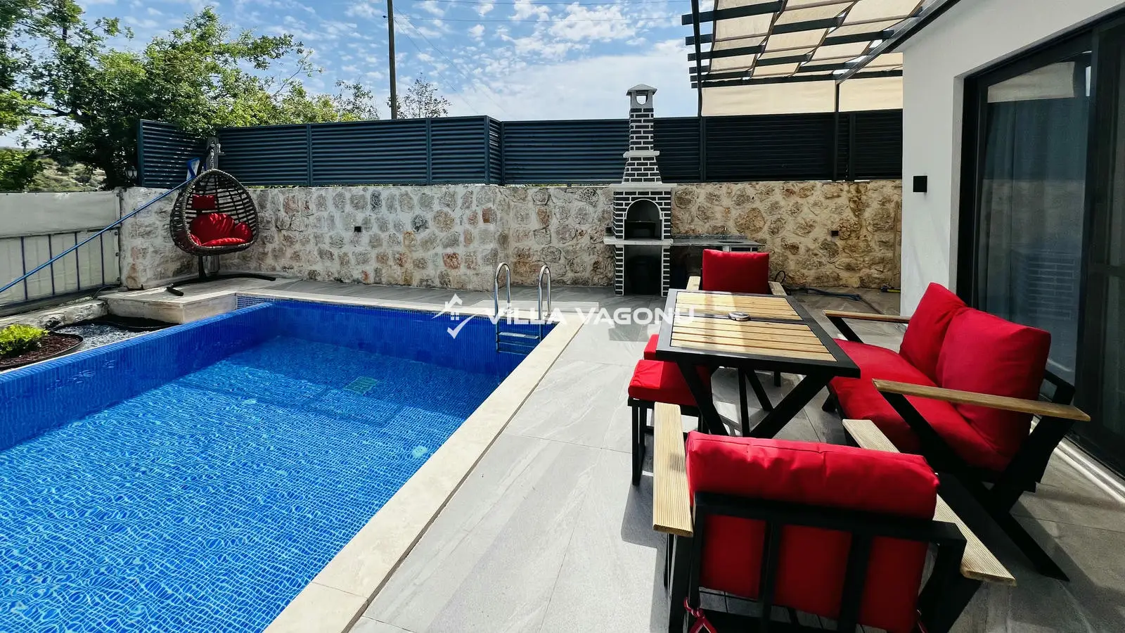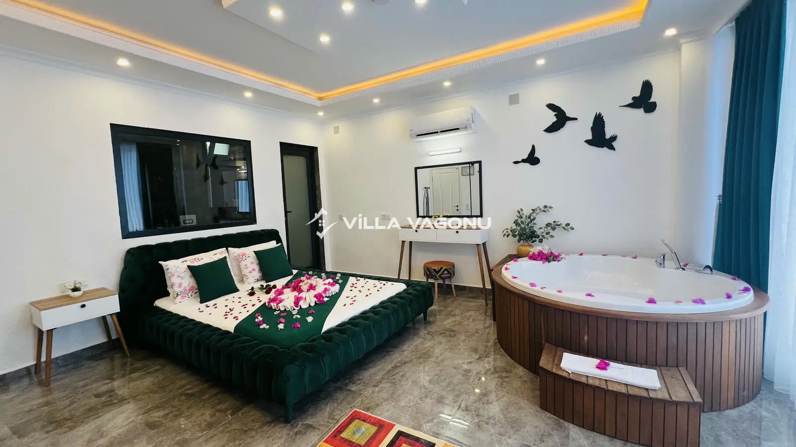 Tatlı ve hoş dekorasyonuyla sizleri karşılayan tatil evinin, havuz terasında kapasiteye uygun oturma alanı, şezlong takımı, barbekü; havuz terasına açılan konforlu oturma odası, ihtiyaçlarınızı karşılayacak donanımlı mutfağı bulunmaktadır. Bir yatak odasında çift kişilik yatak, ikinci yatak odasında da tek kişilik yatak bulunmaktadır. Ayrıca jakuzi de bulunan villada, konforlu bir tatil sizleri beklemektedir.