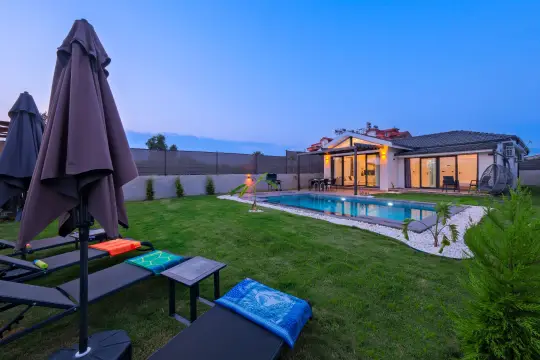 Merkezi konumu sayesinde tercihlerin başında gelen villa, oldukça ferah ve geniş bahçe alanında kapasiteye uygun şezlong takımı, oturma grubu, salıncak ve barbekü alanına sahiptir. Havuz terasına açılan zevkle döşenmiş konforlu oturma odası ve tam donanımlı mutfağı, bir yatak odasında çift kişilik yatak; ikinci yatak odasında da çift kişilik yatak bulunmaktadır. İç mekan yapısı ve donanımları da en az dış mekan kadar ferah, modern ve konforunuz ön planda tutularak oluşturulmuştur.