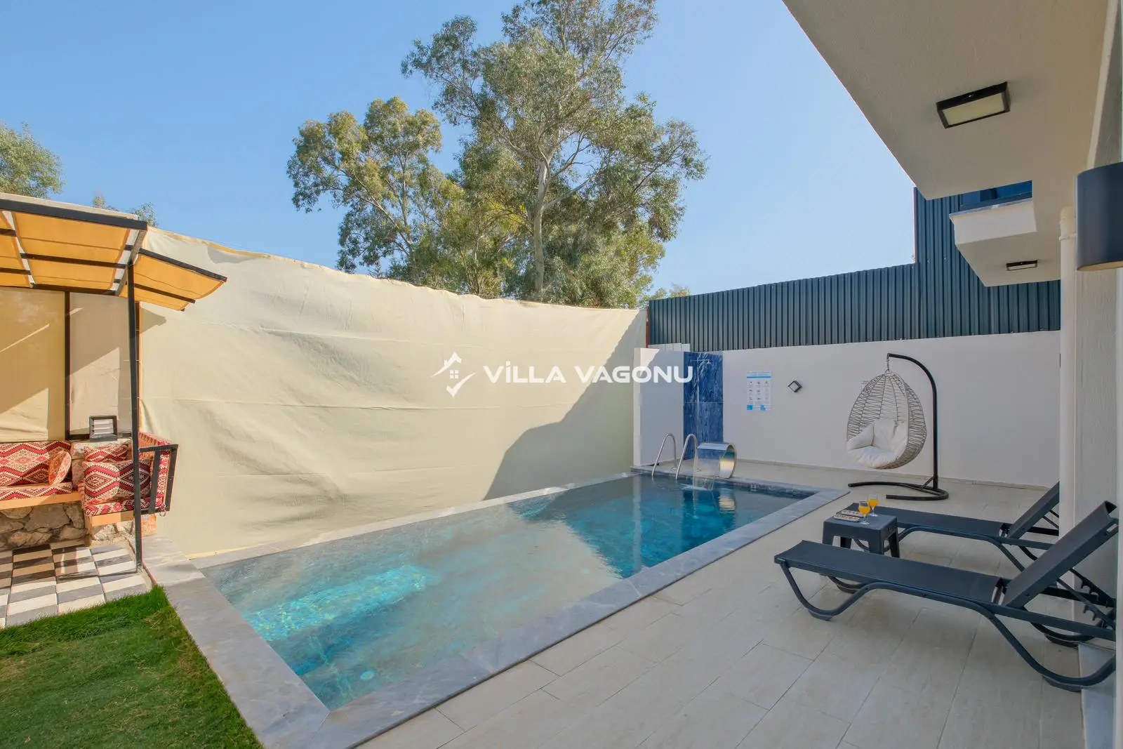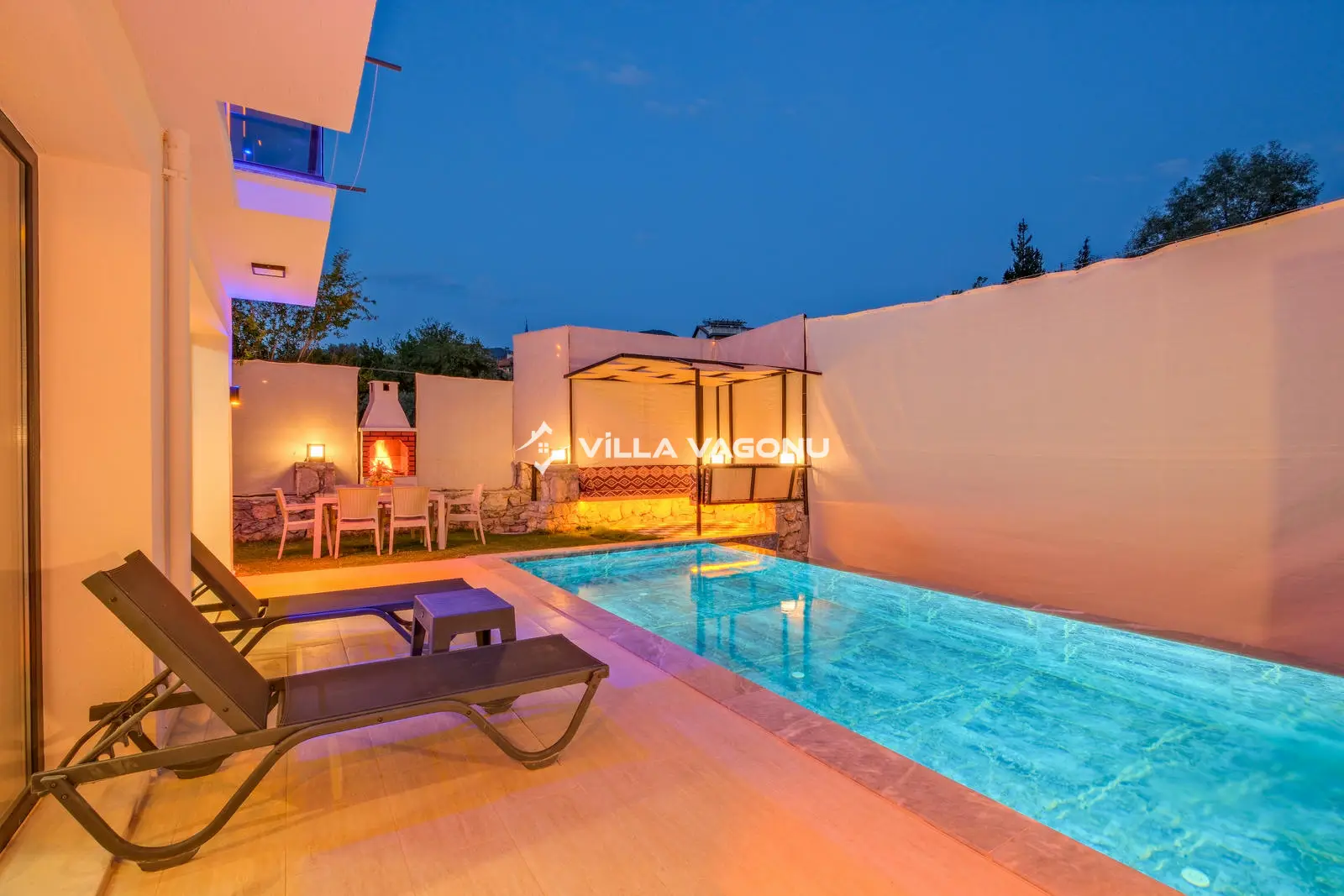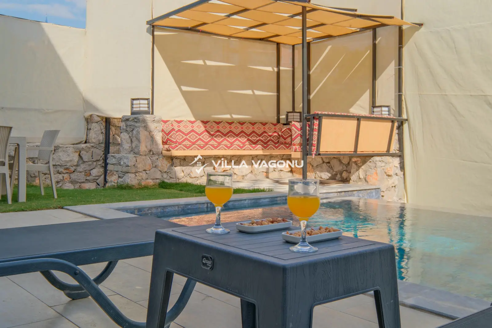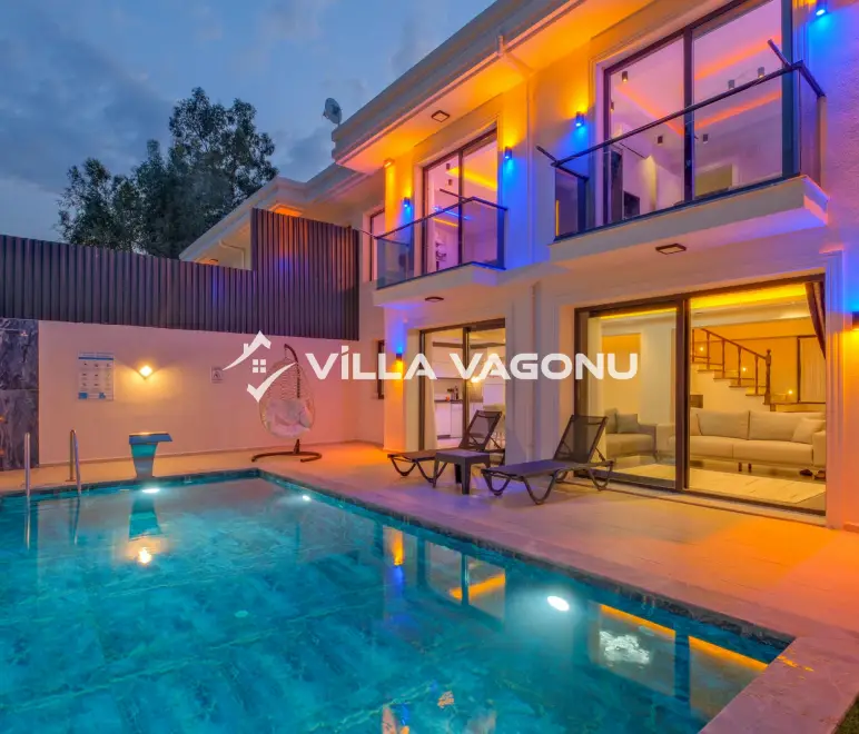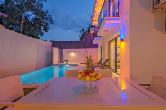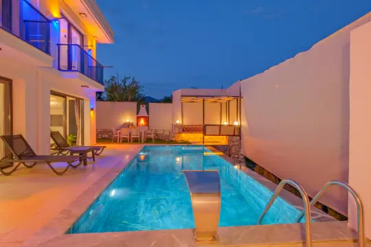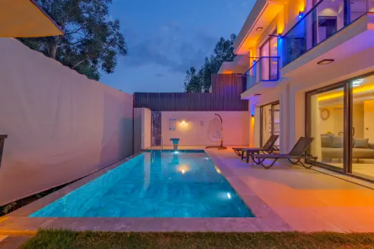 Villamızın özel havuzunda doyasıya yüzebilir ve güneşin keyfini çıkarabilirsiniz. Bahçe alanında kapasiteye uygun şezlong takımı, oturma grubu ve barbekü bulunmaktadır. Havuz terasına açılan konforlu oturma odası ve tam donanımlı açık mutfak, tatilinizi daha da keyifli hale getirecek. Villamızın birinci yatak odasında çift kişilik yatak, ebeveyn banyosu ve jakuzi; ikinci yatak odasında ise iki adet tek kişilik yatak ve banyo yer almaktadır.