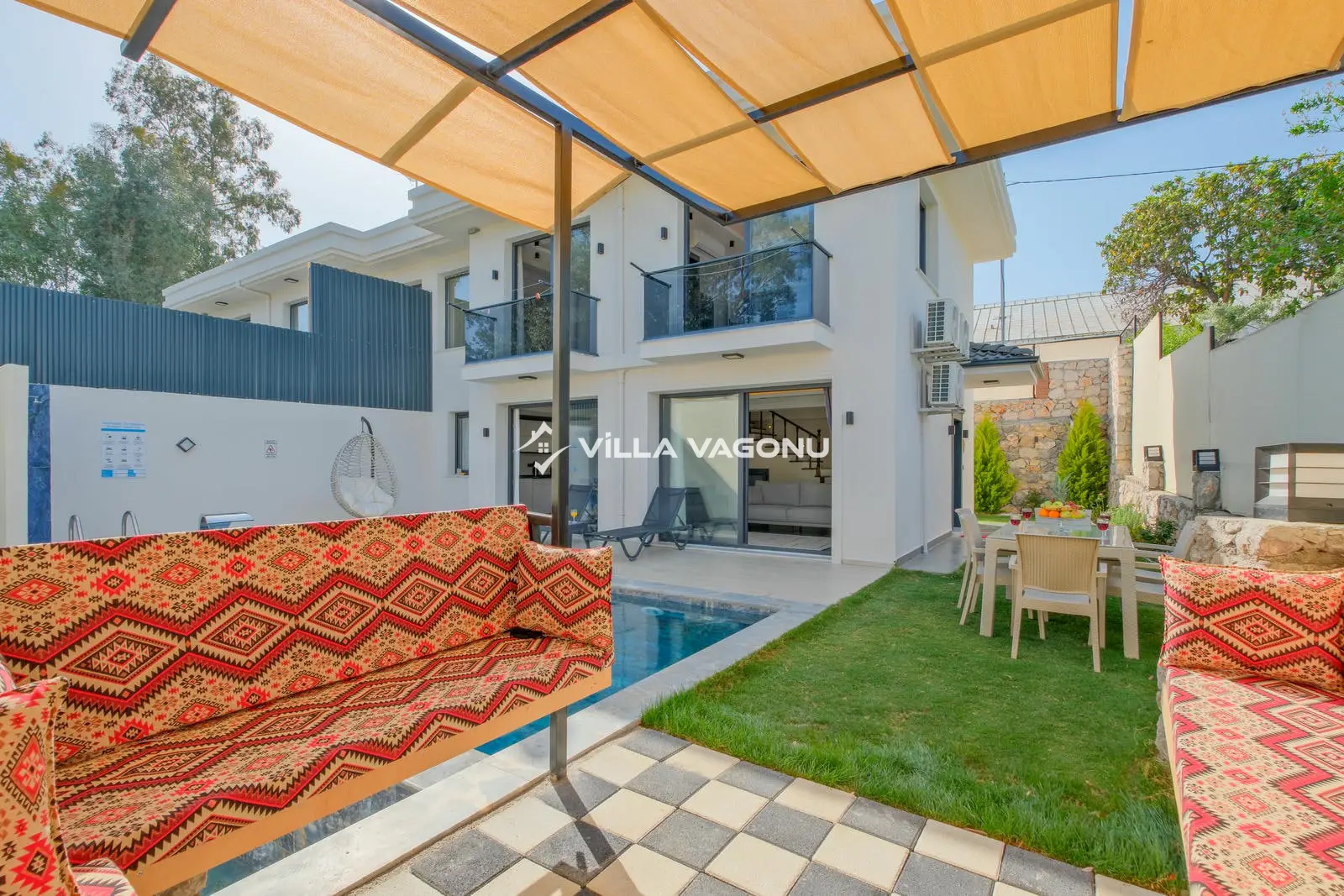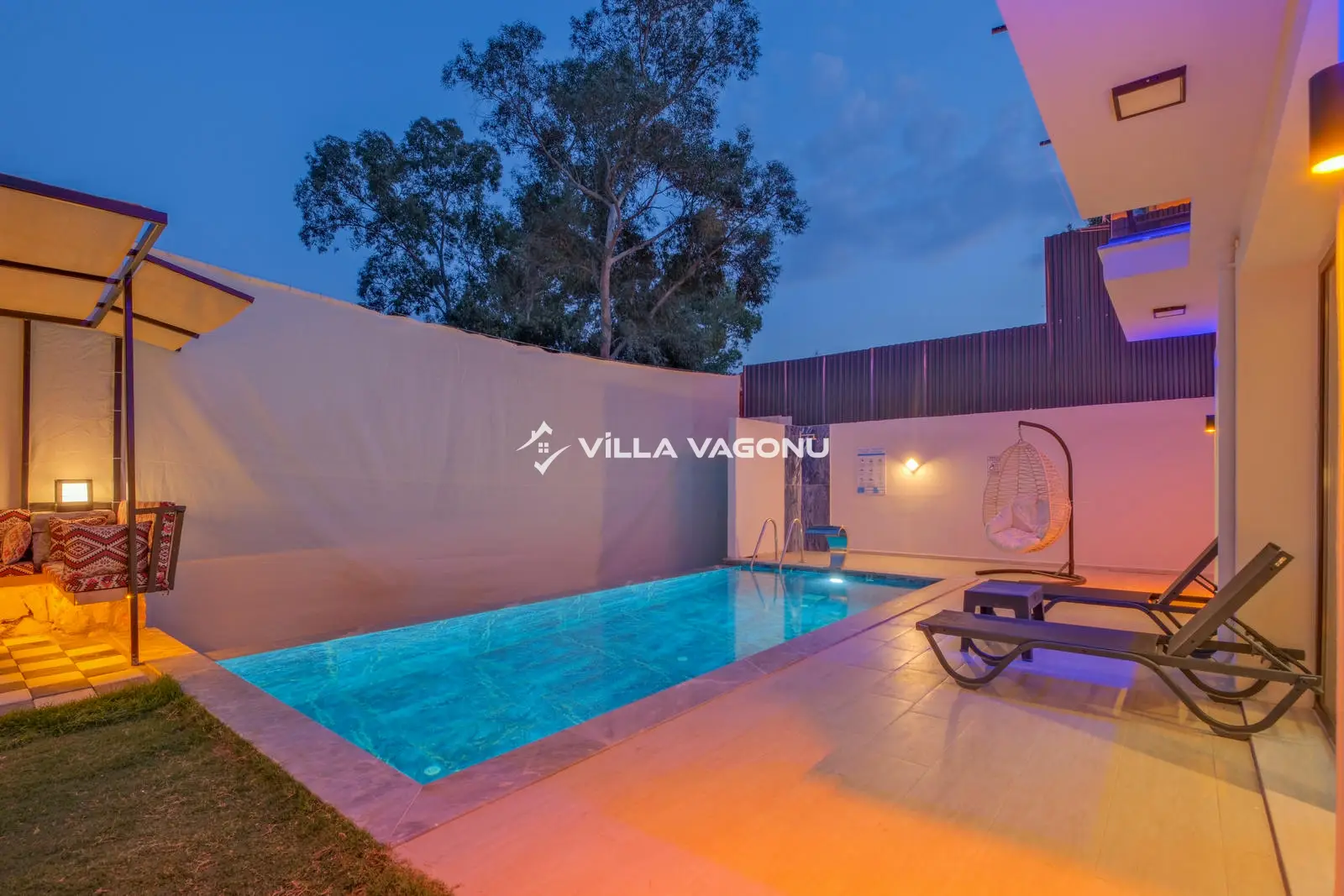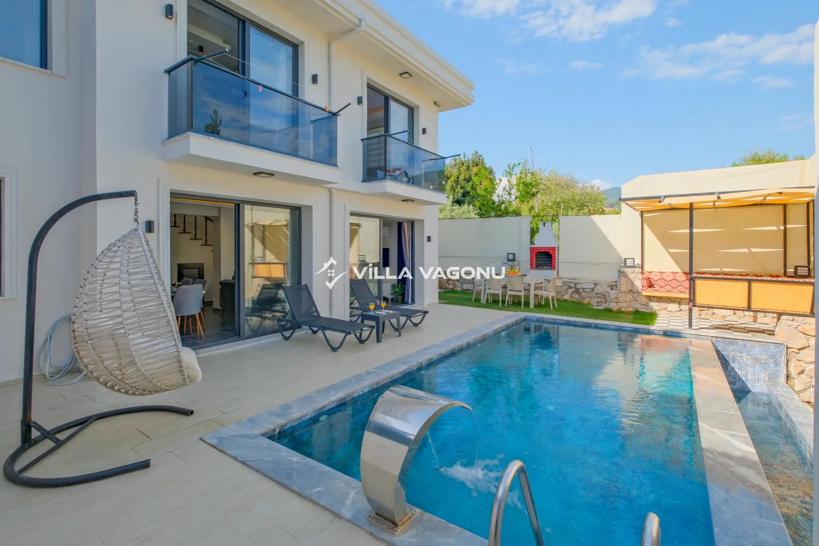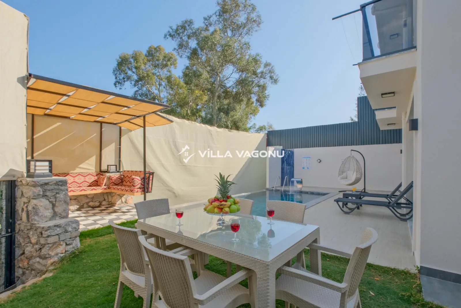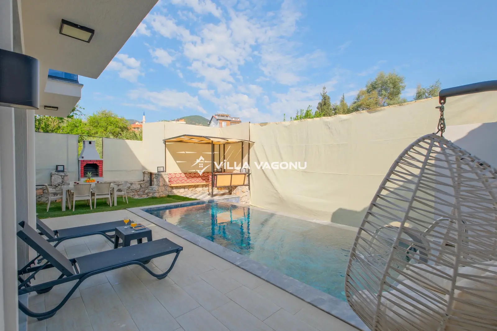 Villamızın özel havuzunda doyasıya yüzebilir ve güneşin keyfini çıkarabilirsiniz. Bahçe alanında kapasiteye uygun şezlong takımı, oturma grubu ve barbekü bulunmaktadır. Havuz terasına açılan konforlu oturma odası ve tam donanımlı açık mutfak, tatilinizi daha da keyifli hale getirecek. Villamızın birinci yatak odasında çift kişilik yatak, ebeveyn banyosu ve jakuzi; ikinci yatak odasında ise iki adet tek kişilik yatak ve banyo yer almaktadır.