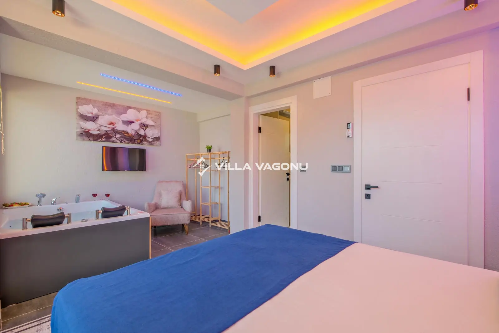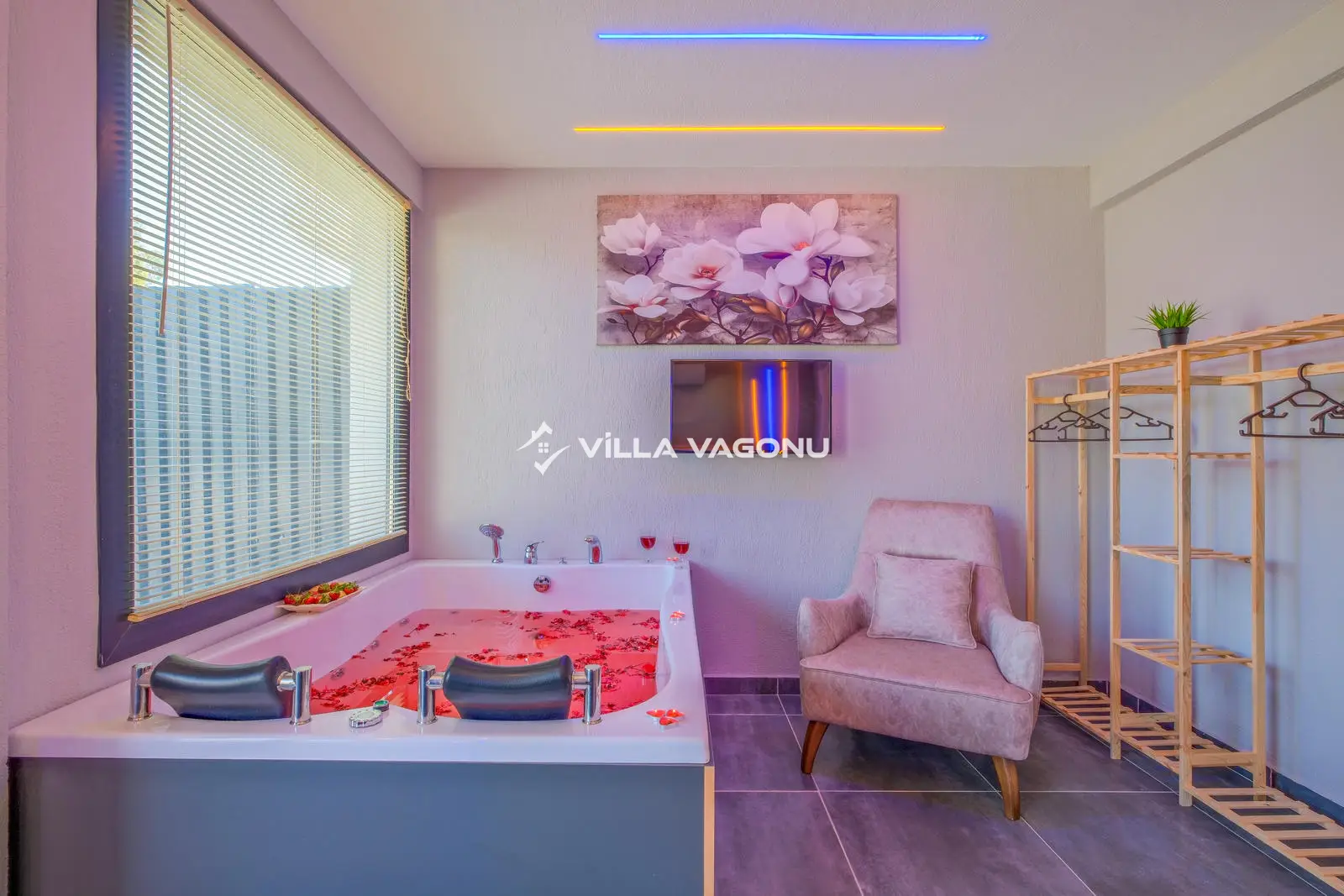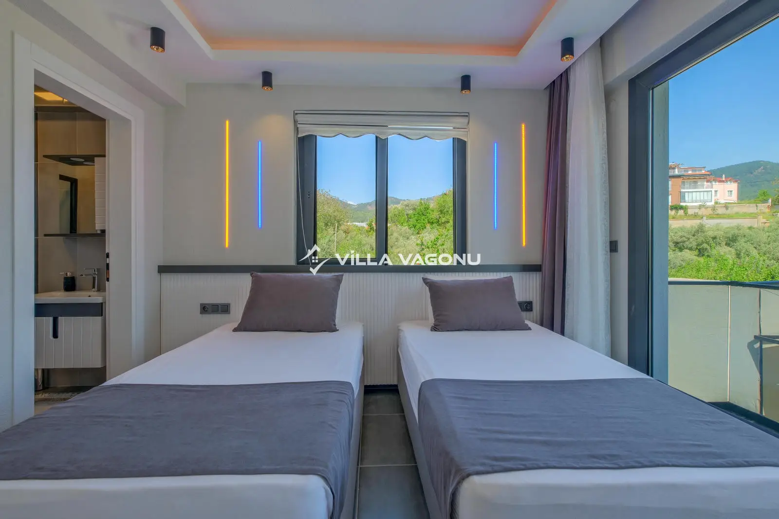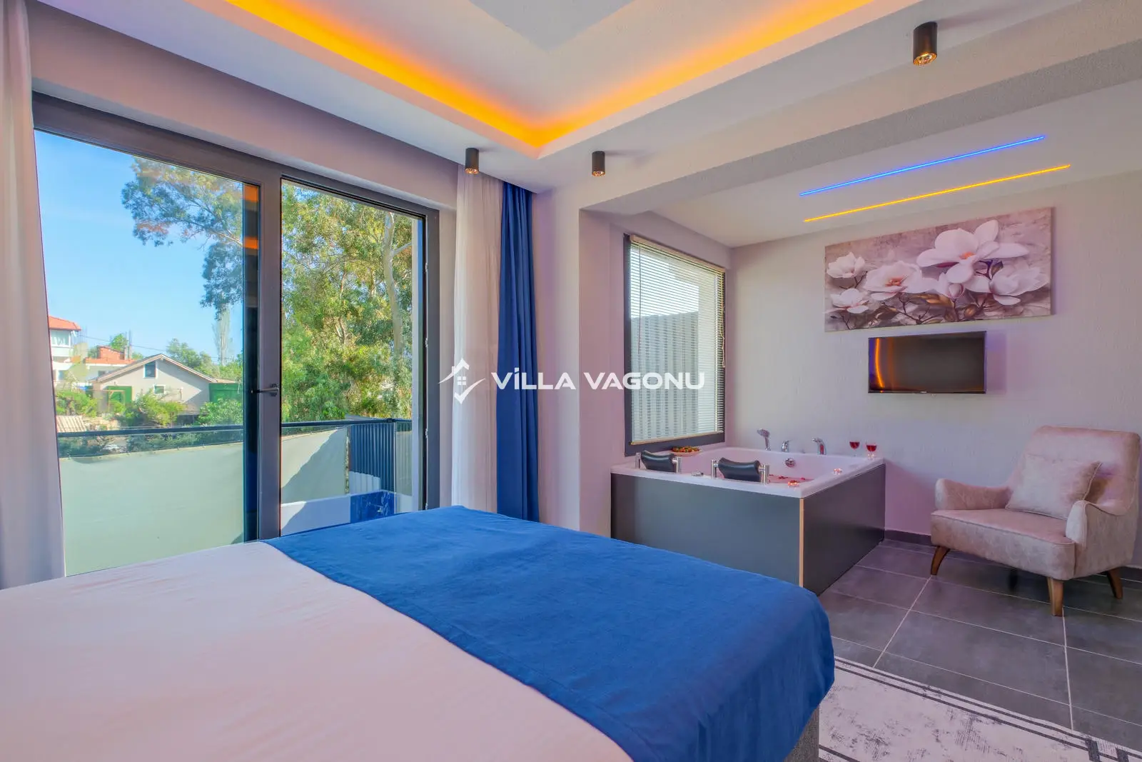 Villamızın özel havuzunda doyasıya yüzebilir ve güneşin keyfini çıkarabilirsiniz. Bahçe alanında kapasiteye uygun şezlong takımı, oturma grubu ve barbekü bulunmaktadır. Havuz terasına açılan konforlu oturma odası ve tam donanımlı açık mutfak, tatilinizi daha da keyifli hale getirecek. Villamızın birinci yatak odasında çift kişilik yatak, ebeveyn banyosu ve jakuzi; ikinci yatak odasında ise iki adet tek kişilik yatak ve banyo yer almaktadır.