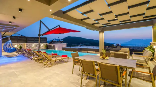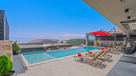 Muhteşem manzaraya karşı, güneşlenip yüzebileceğiniz havuz terasında kapasiteye uygun şezlong takımı, oturma grubu ve barbekü alanı bulunan villa lüks ve donanımı bir arada sunmaktadır. Yine havuz terasına açılan konforlu oturma odası ve tam donanımlı açık mutfağı; bir yatak odasında çift kişilik yatak, ebeveyn banyosu ve küvet; ikinci yatak odasında çift kişilik yatak ve ebeveyn banyosu; üçüncü yatak odasında da iki tek kişilik yatak ve ebeveyn banyosu bulunmaktadır.