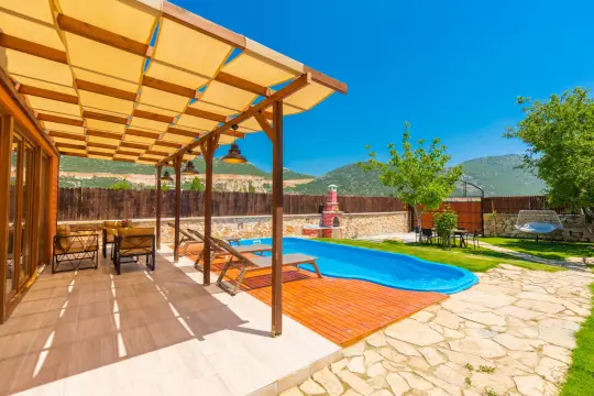 Kalkan Bezirgan mevkiinde yer alan villa, sizlere huzurlu bir konaklama deneyimi sunuyor. 2 yatak odasıyla 4 kişilik konaklama kapasitesine sahip olan villamız, balayı çiftleri ve çekirdek aileler için ideal bir tercihtir. Korunaklı havuz alanlı ferah iç mekanları ve zarif tasarımı ile göz dolduran villa, doğa manzarasına hakimdir.