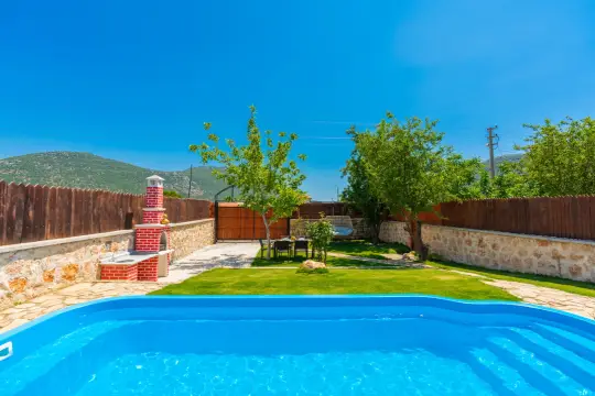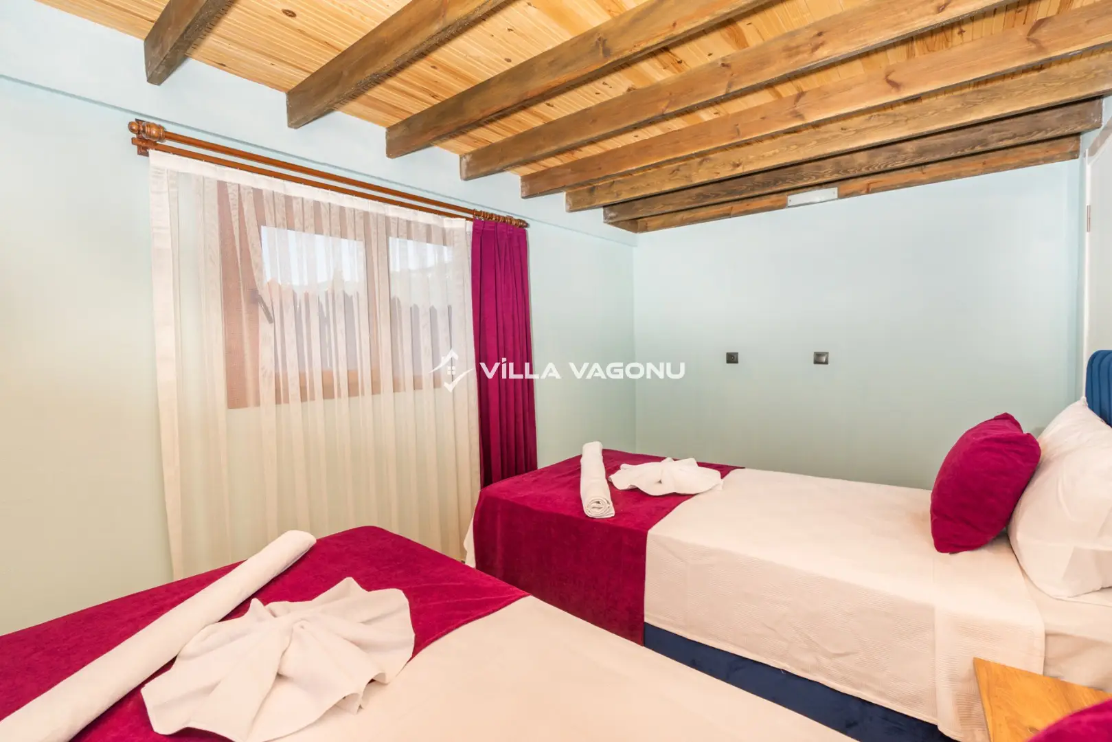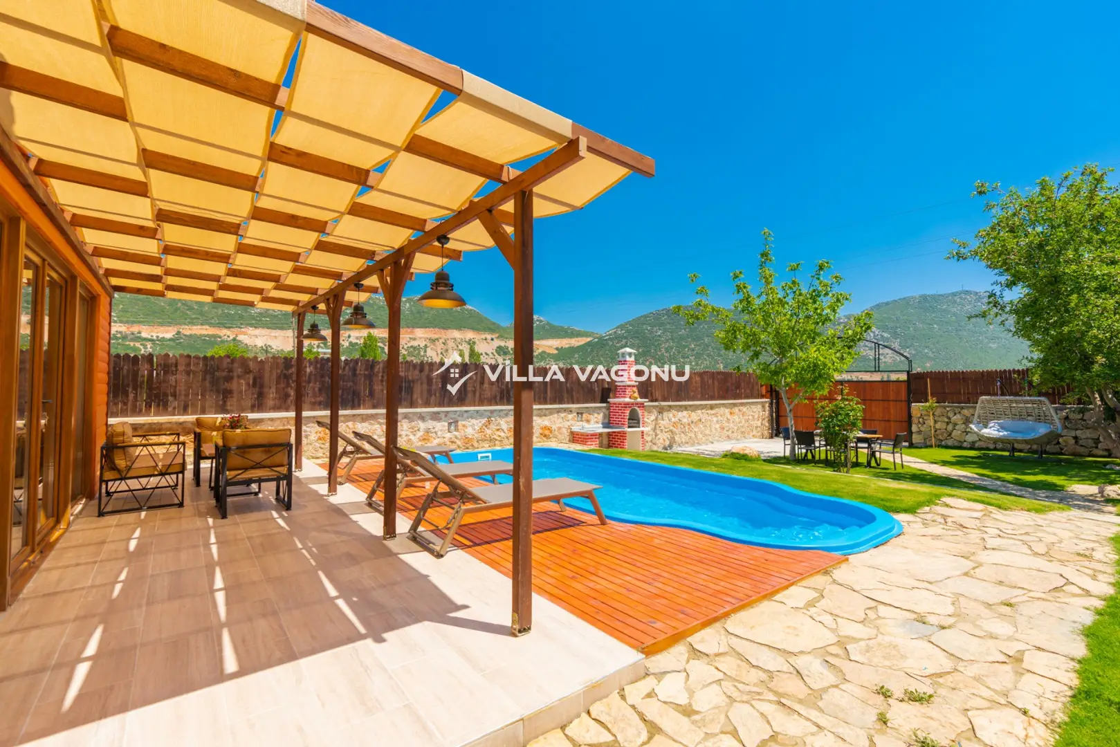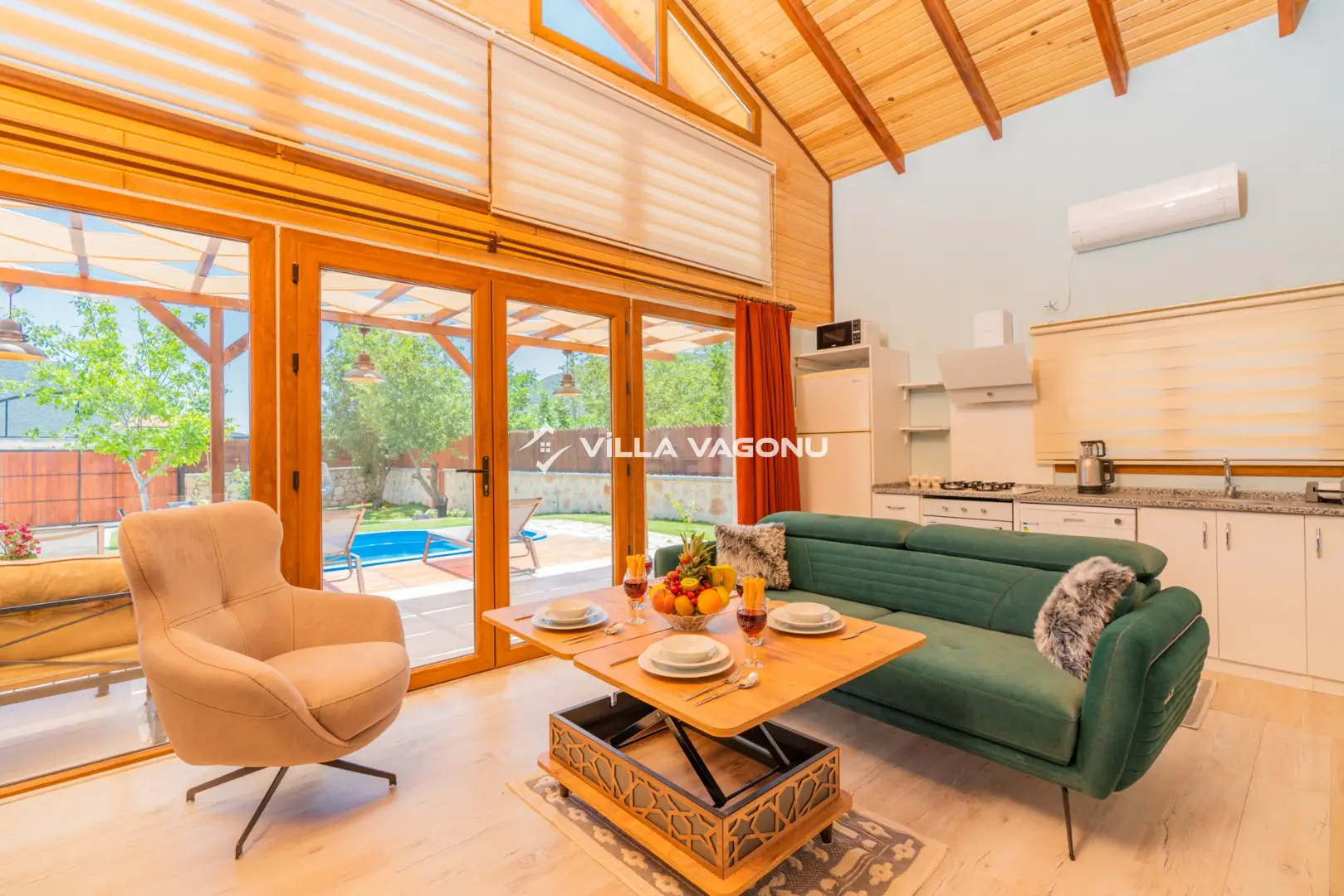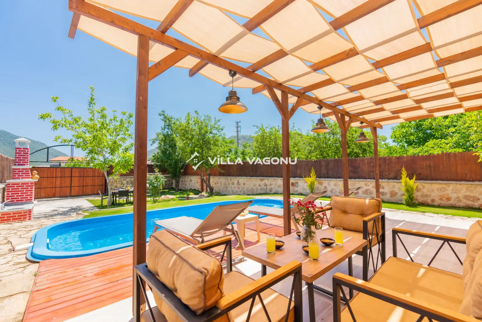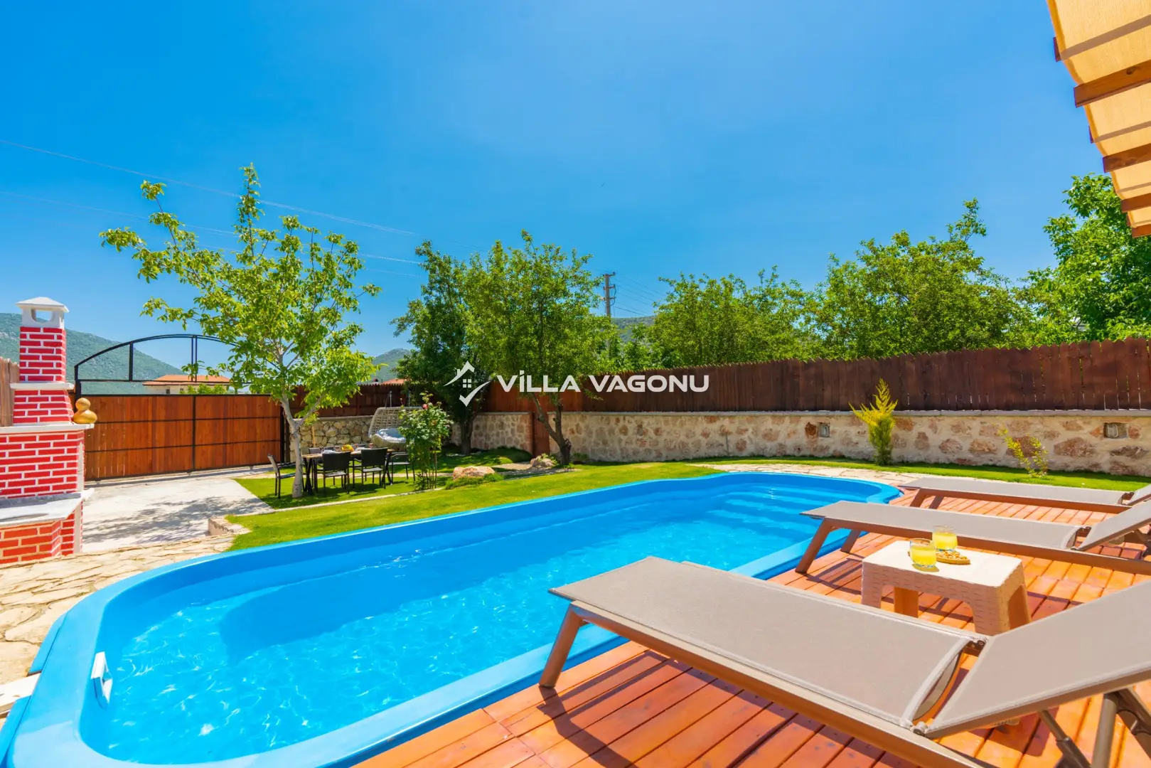 Villamızın özel havuzunda doyasıya yüzebilir ve güneşin keyfini çıkarabilirsiniz. Bahçe alanında kapasiteye uygun şezlong takımı, oturma grubu ve barbekü bulunmaktadır. Havuz terasına açılan konforlu oturma odası ve tam donanımlı açık mutfak, tatilinizi daha da keyifli hale getirecek. Villamızın birinci yatak odasında çift kişilik yatak , ikinci yatak odasında ise iki adet tek kişilik yatak yer almaktadır. Villamızda bir adet ortak banyo ve wc bulunmaktadır. Villamız bir yatak odasında klima olup , asma tavan yatak odası kısmında klima bulunmamaktadır.