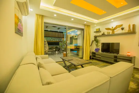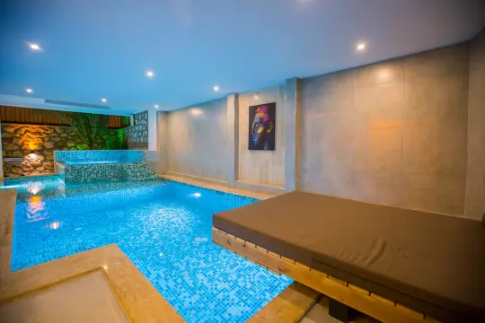 Doğa ile iç içe konumlanan villa bünyesinde kapasiteye uygun mobilyalar, ihtiyacınız olan tüm araç-gereçleri barındıran Amerikan tarzda mutfak ve 1 adet yatak odası mevcuttur. Konforunuz odaklı tasarlanan villanın yatak odasında özel kullanım banyo/wc, klima ve jakuzisi mevcuttur. Lüks bir tasarıma sahip olan villanın jakuzisinin yanı sıra saunası da bulunmaktadır. Korunaklı ve ısıtma sistemli havuz terasında kapasiteye uygun şezlong ve şemsiye, oturma alanı, yemek masası, barbekü alanı ve salıncak bulunmaktadır. Keyifli dakikalar geçirmeniz için villamızda 1 adet langırt masası da mevcuttur.