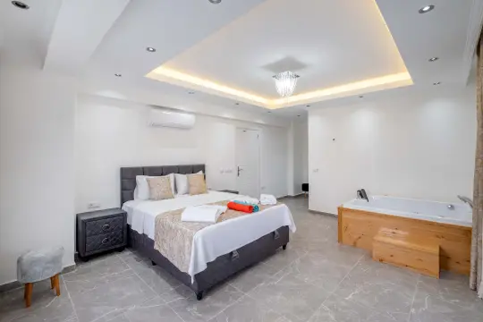 Doğa ile iç içe konumlanan villa bünyesinde kapasiteye uygun mobilyalar, ihtiyacınız olan tüm araç-gereçleri barındıran Amerikan tarzda, modern mutfak ve 4 adet yatak odası mevcuttur. Konforunuz odaklı tasarlanan villanın yatak odalarının tümünde klima ve özel kullanım banyo/wc bulunmaktadır. Ebeveyn suiy yatak odasında günün yorgunluğunu atmanızı ve tatilin keyfini çıkarmanızı sağlayacak 1 adet jakuzisi mevcuttur. Lüks tasarımı ve ihtişamı ile villamız bünyesinde sauna da bulunmaktadır. Korunaklı havuzu ve müstakil bahçesinde kapasiteye uygun şezlong ve şemsiye oturma alanı, yemek masası, salıncak ve barbekü alanı bulunmktadır.