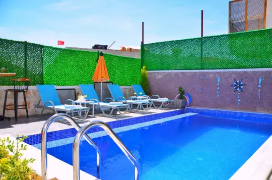 Geniş havuz ve bahçe alanına sahip villada, kapasiteye uygun oturma alanı, şezlong takımı, barbekü; havuz terasına açılan konforlu oturma odası, oturma odasında sizlere eşlik eden eğlenceli villamız ihtiyaçlarınızı karşılayacak donanıma sahip şık mutfağı bulunmaktadır. Birinci yatak odasında çift kişilik yatak; ikinci yatak odasında ise iki tek kişilik yatak , üçüncü yatak odasında çift kişilik yatak mevcuttur.