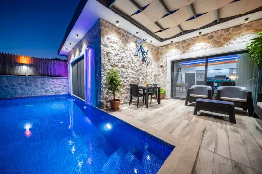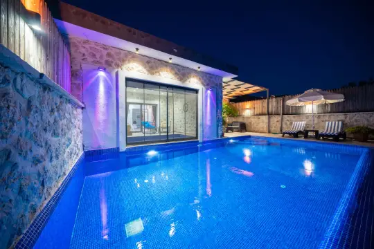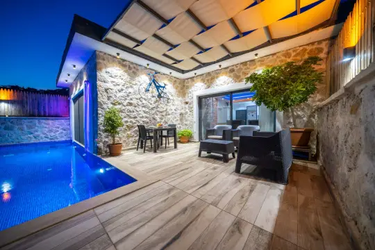 Muhteşem manzaraya karşı, güneşlenip yüzebilir havuz terasında kapasiteye uygun yatak takımı, oturma grubu ve mutfak alanı bulunan villanın, yine havuz terasına açılan konforlu oturma odası ve tam donanımlı açık mutfağı; bir yatak odası çift kişilik yatak ebeveyn odası ve jakuzi; diğer yatak odası iki tek kişilik yatak bulunmaktadır. Kapalı havuz sayesinde keyifli zaman geçirebilirsiniz.