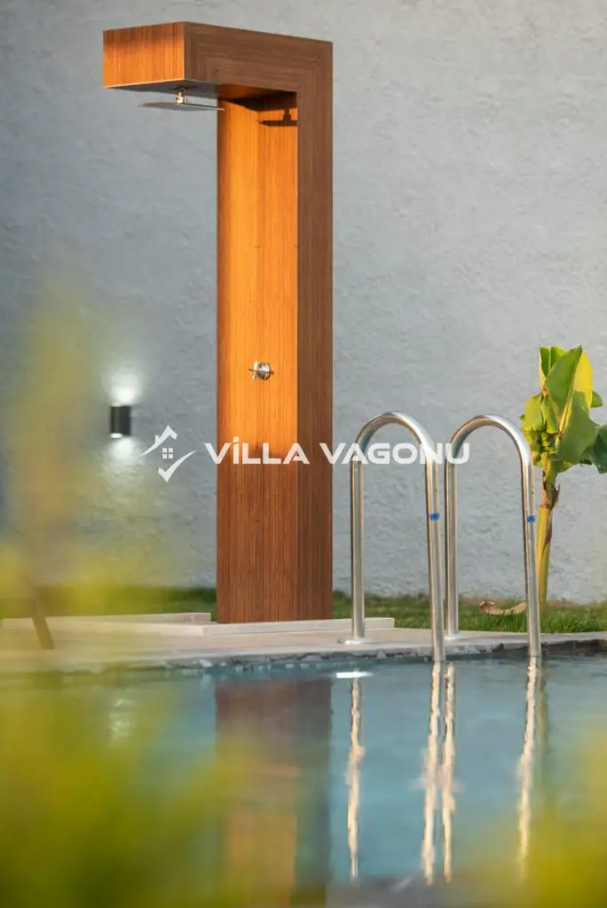 Geniş havuz terasında kapasiteye uygun şezlong takımı, oturma grubu, salıncak ve barbekü alanı bulunan villada, rahat bir tatil için her detay düşünülmüştür. Yine havuz terasına açılan konforlu oturma odası ve tam donanımlı açık mutfağı; bir yatak odasında çift kişilik yatak, ebeveyn banyosu ve jakuzi, ikinci yatak odasında çift kişilik yatak, ebeveyn banyosu; üçüncü yatak odasında çift kişilik yatak ve banyo WC, son olarak dördüncü yatak odasında da iki tek kişilik yatak ve banyo WC bulunmaktadır.