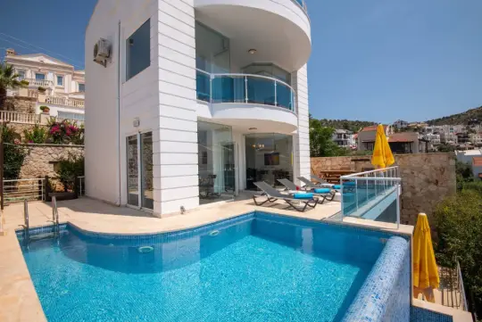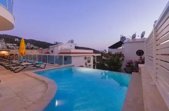 Kalkan Kışla mevkiinde bulunan villa, 4 yatak odasıyla 8 kişilik konaklama kapasitesi sunmaktadır. Geniş havuz ve bahçe alanına sahip olan villa kalabalık aile ve arkadaş grupları için uygun seçenekler arasındadır. Eşsiz deniz manzarasına sahip villamız da çatı katında bulunan jakuzi ile keyifli zaman geçirebilirsiniz.