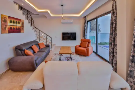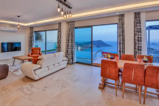 Muhteşem deniz ve şehir yapısına sahip villa kapasitesiye uygun mobilyalar, ihtiyacınız olan tüm araç gereçleri, Amerikan hizmetlerini barındıran, modern mutfak ve 2 adet yatak odası mevcuttur. Konforunuz odaklı tasarlanmış villanın yatak odalarının tamamında klima ve özel kullanım banyo/wc bulunmaktadır. Villanın ebeveyn suit yatak odasının günün yorgunluğunu ve tatil keyfini çıkarmanızı sağlayacak 1 adet jakuzisi de mevcuttur. Korunaklı havuz terasında kapasiteye uygun şezlong ve şemsiyeler, oturma alanı, yemek masası ve kombi alanı bulunmaktadır.