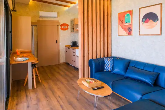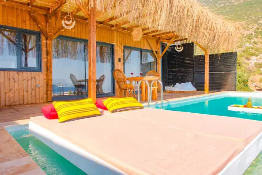 Doğa ile iç içe, deniz nazır bir yapıda bulunan villa bünyesinde kapasiteye uygun mobilyalar, ihtiyacınız olan tüm araç-gereçleri içeren Amerikan tarzda, modern mutfak ve 1 adet yatak odası mevcuttur. Villanın korunaklı odasının düzenidirler ve şemsiyeler, oturma alanı, yemek masası ve şalter mevcuttur. Yine de havuz kenarında günün yorgunluğundan arınacağınız ve tatilin keyfini çıkaracağınız 1 adet jakuzisi bulunmaktadır.