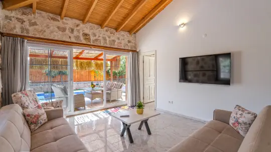 Doğa içinde bulunan villada kapasiteye uygun oturma alanı, oturma takımı, seramik alanı; havuz manzarasına sahip konforlu oturma odası, ihtiyaçlarınızı karşılayacak donanım mutfağı bulunmaktadır. Bir yatak odası çift kişilik yatak, ebeveyn odası; ikinci yatak odası çift kişilik yatak bulunmaktadır.