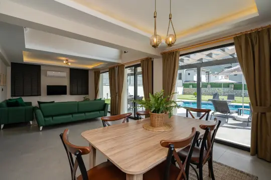Göz dolduran genişliğe ve ferahlığa sahip villa bünyesinde kapasiteye uygun mobilyalar, ihtiyacınız olan tüm araç gereçler, modern mutfak ve 3 adet yatak odası mevcuttur. Konforunuz odaklı tasarlanan villanın tüm yatakları klima ve özel kullanım banyo/wc'si bulunmaktadır. Villanın ebeveyn suit yatak odasında günün yorgunluğunu atmanızı ve tatilin keyfini çıkarmanızı sağlayacak 1 adet jakuzi ve TV bulunmaktadır. Villanın müstakil bahçesi ve korunaklı havuz gösteriminde yine kapasiteye uygun program ve şemsiye, oturma alanı, yemek masası ve donanım alanı mevcuttur.