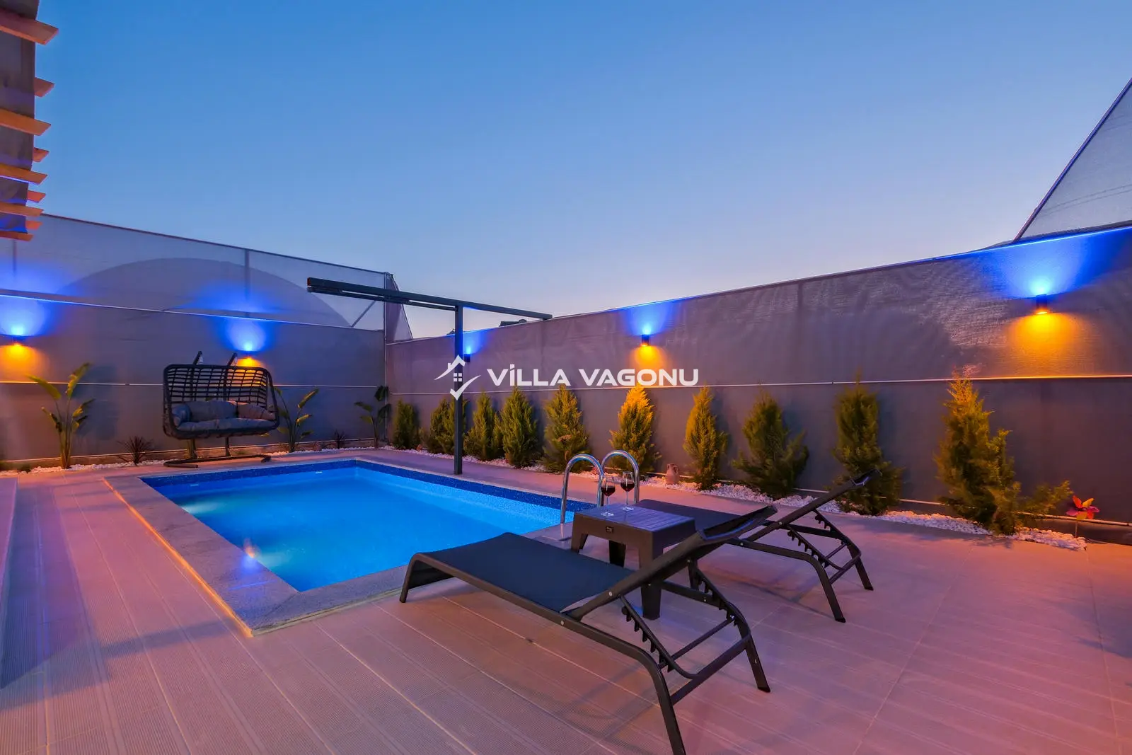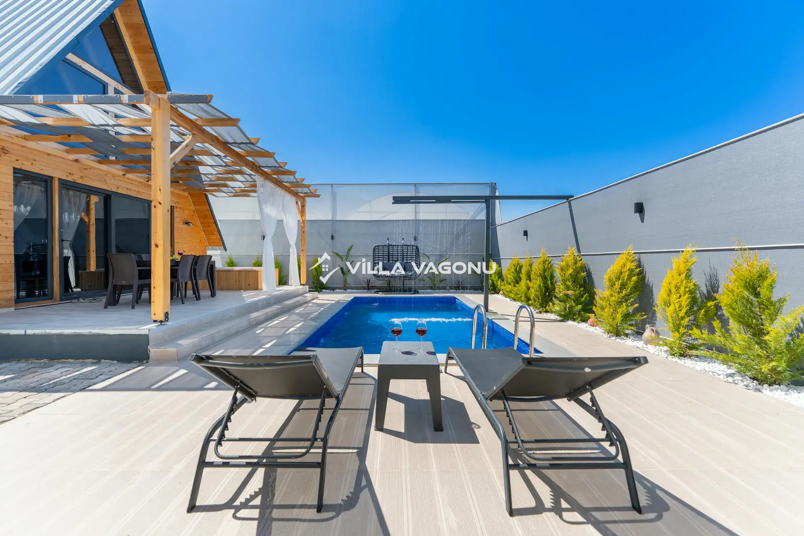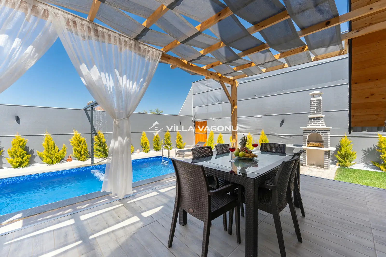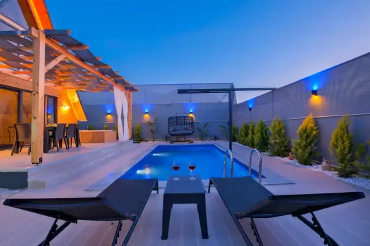 Villamızın özel havuzunda doyasıya yüzebilir ve güneşin keyfini çıkarabilirsiniz. Bahçe alanında kapasiteye uygun şezlong takımı, oturma grubu ve barbekü bulunmaktadır. Havuz terasına açılan konforlu oturma odası ve tam donanımlı açık mutfak, tatilinizi daha da keyifli hale getirecek. Villamızın birinci yatak odasında çift kişilik yatak, ebeveyn banyosu; ikinci yatak odasında ise bir adet çift kişilik yatak yer almaktadır.