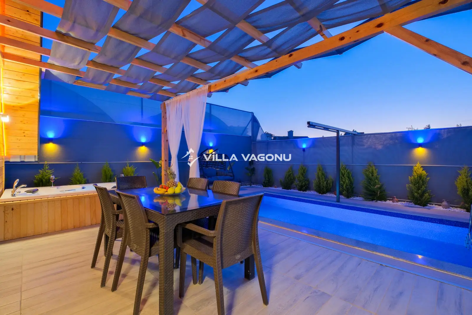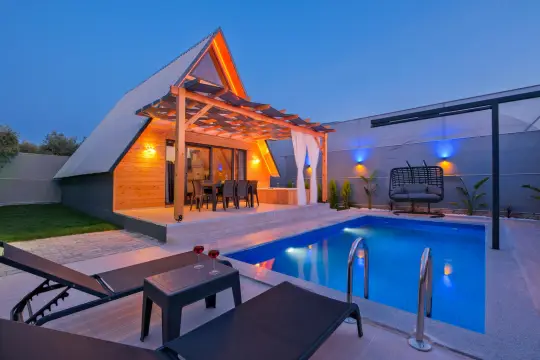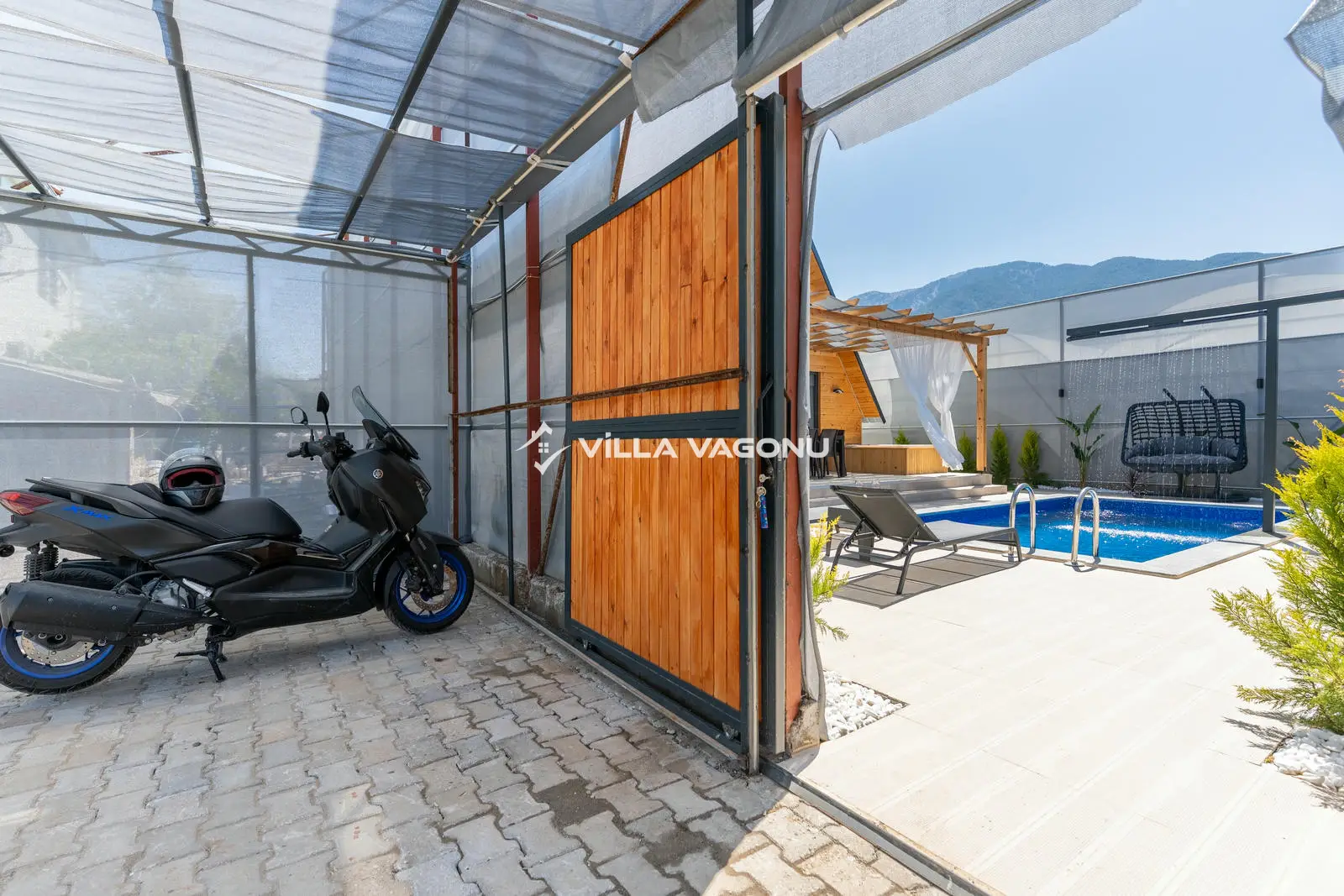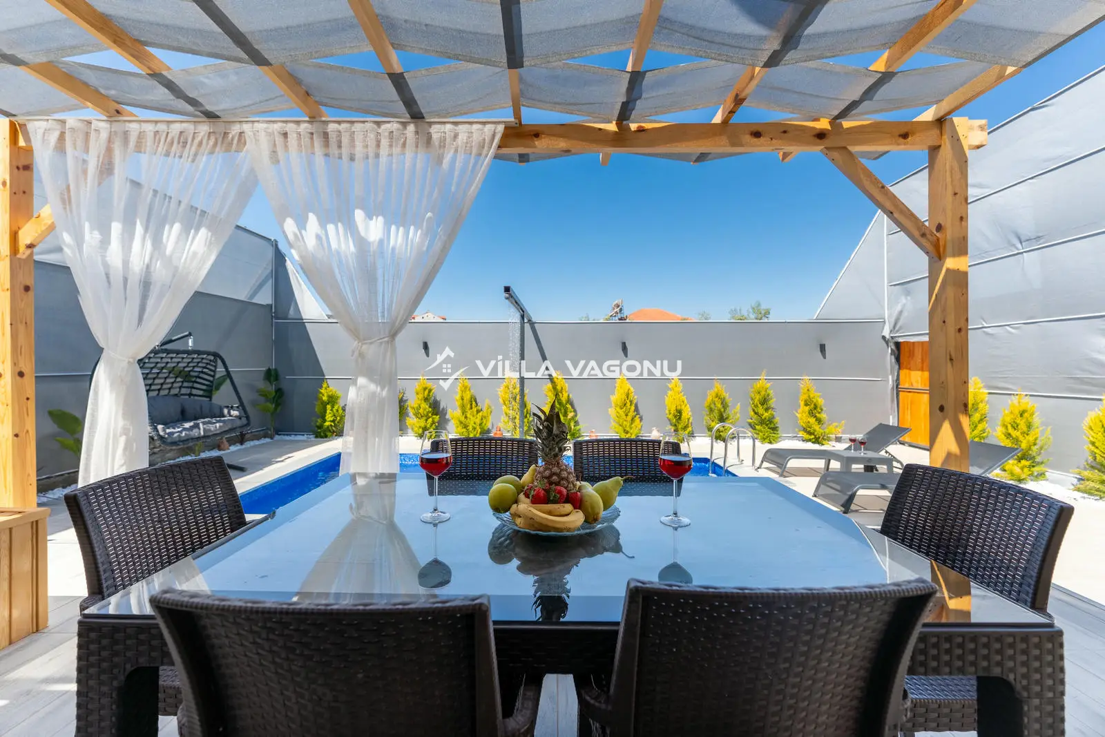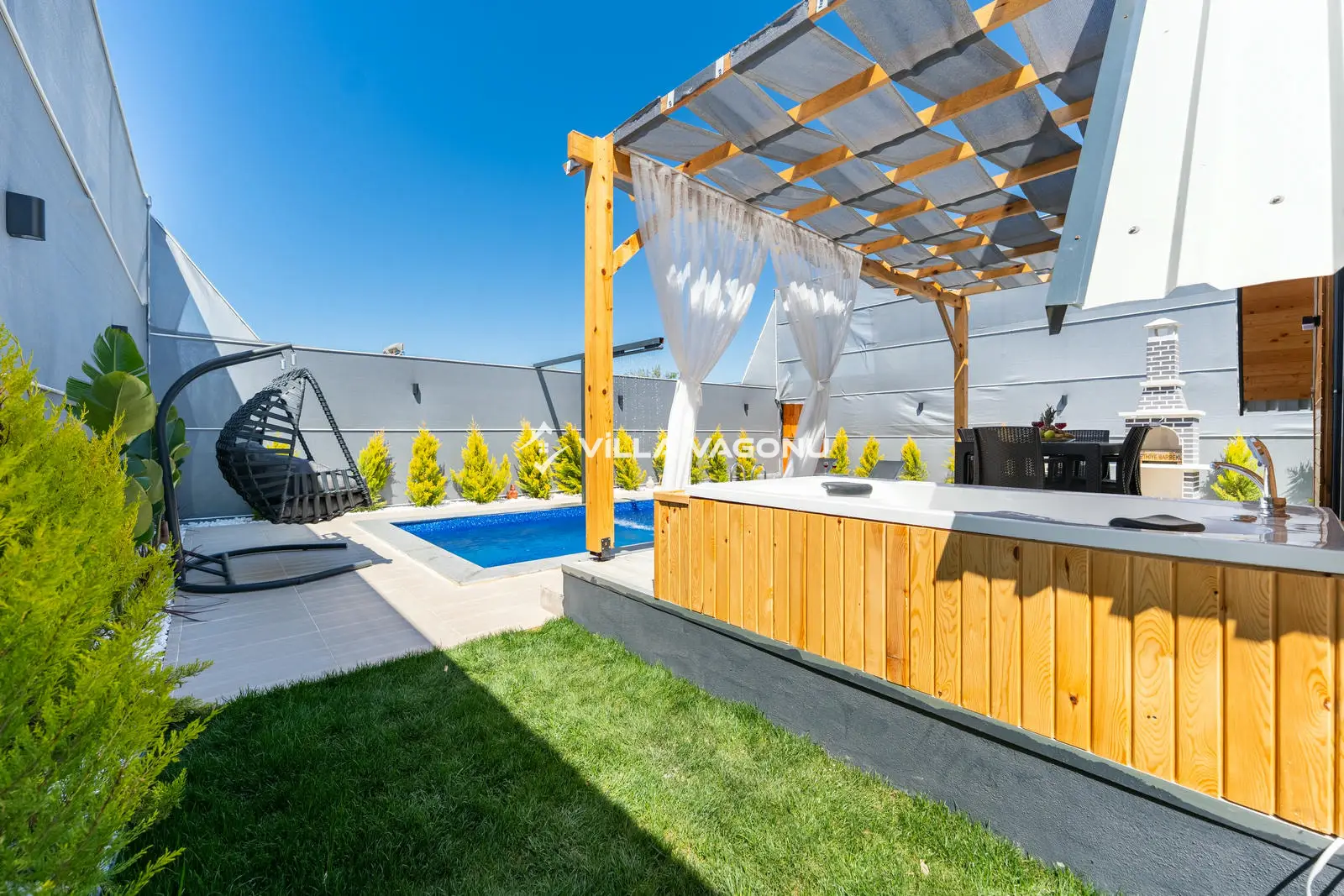 Villamızın özel havuzunda doyasıya yüzebilir ve güneşin keyfini çıkarabilirsiniz. Bahçe alanında kapasiteye uygun şezlong takımı, oturma grubu ve barbekü bulunmaktadır. Havuz terasına açılan konforlu oturma odası ve tam donanımlı açık mutfak, tatilinizi daha da keyifli hale getirecek. Villamızın birinci yatak odasında çift kişilik yatak, ebeveyn banyosu; ikinci yatak odasında ise bir adet çift kişilik yatak yer almaktadır.