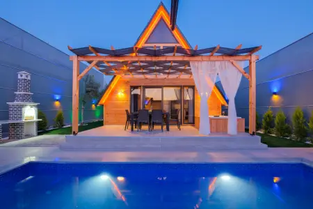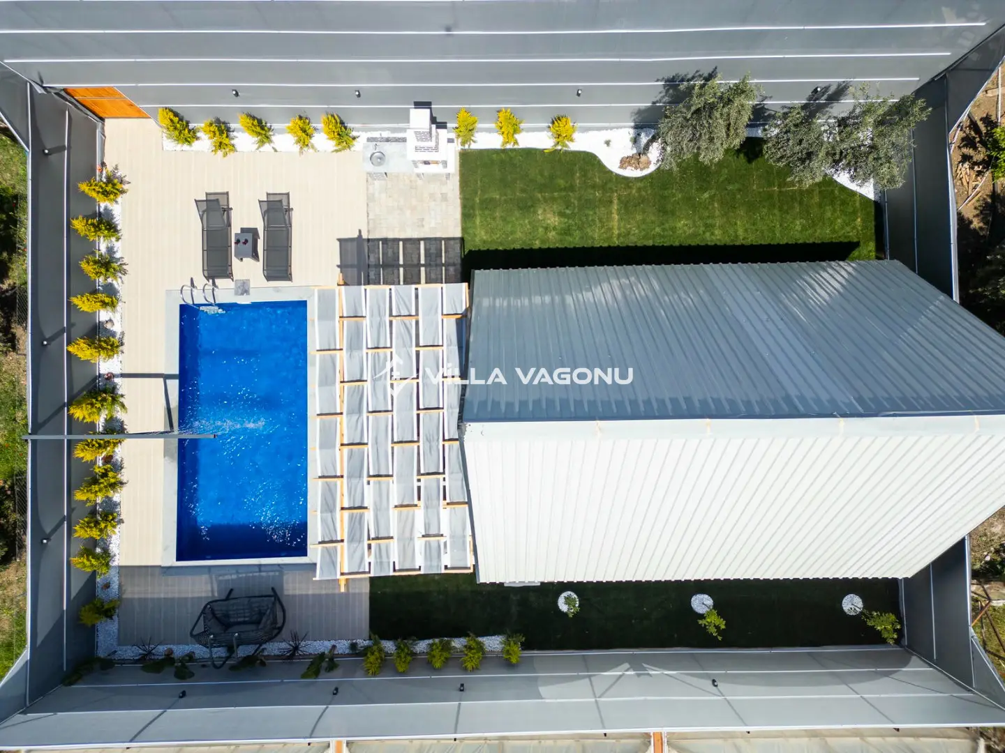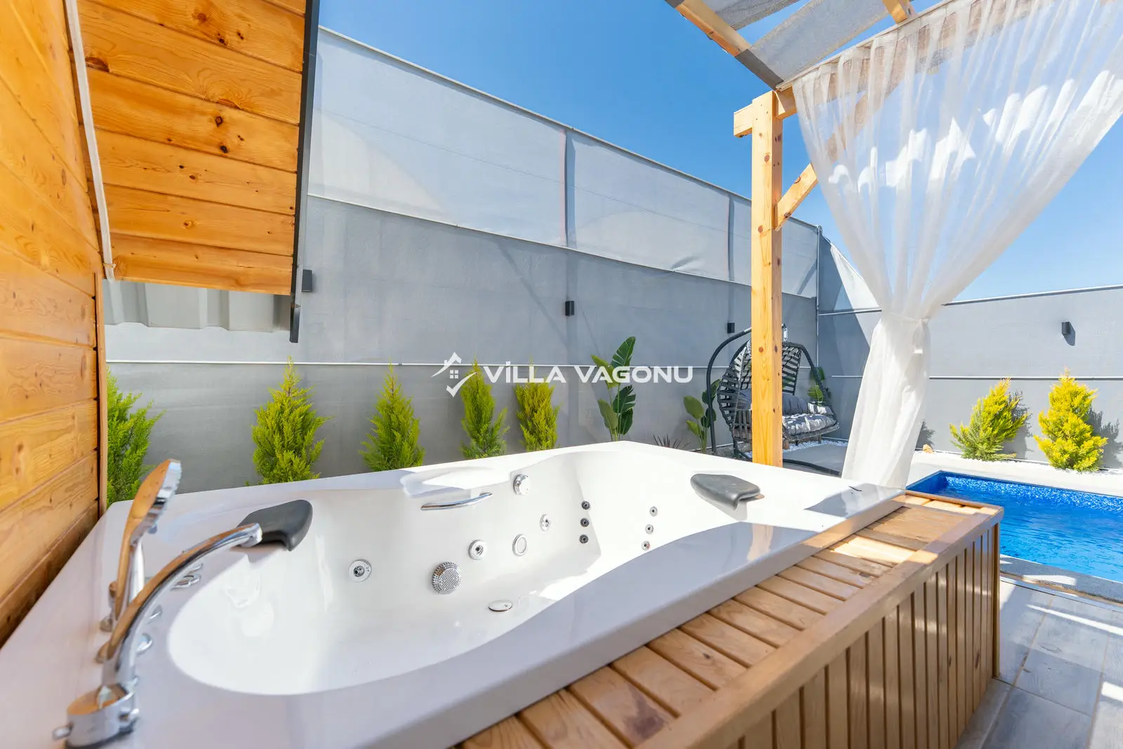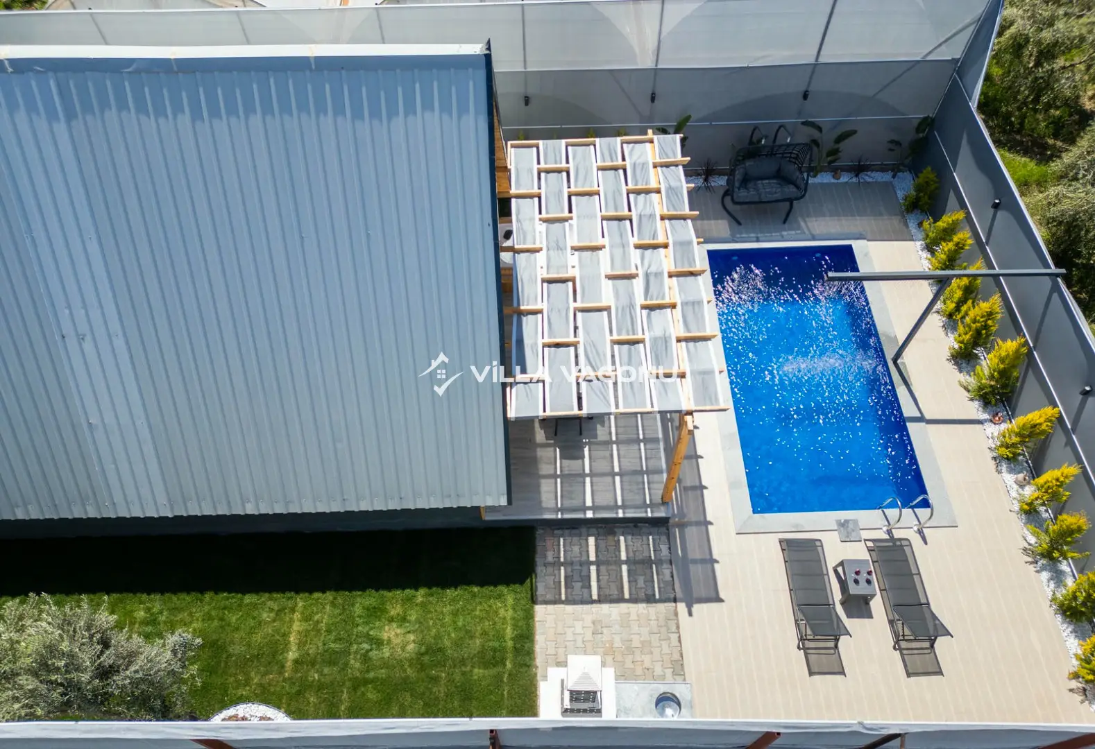 Villamızın özel havuzunda doyasıya yüzebilir ve güneşin keyfini çıkarabilirsiniz. Bahçe alanında kapasiteye uygun şezlong takımı, oturma grubu ve barbekü bulunmaktadır. Havuz terasına açılan konforlu oturma odası ve tam donanımlı açık mutfak, tatilinizi daha da keyifli hale getirecek. Villamızın birinci yatak odasında çift kişilik yatak, ebeveyn banyosu; ikinci yatak odasında ise bir adet çift kişilik yatak yer almaktadır.