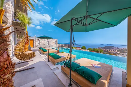 Kalkan Kızıltaş mevkiinde bulunan 4 yatak odalı ve 9 kişilik konaklama kapasitesine sahip lüks bir villadır. Jakuzisi ve saunası gibi lüksleri bulunan, eşsiz deniz manzarasına sahip villa; geniş aileler ve kalabalık arkadaş grupları için uygun bir villadır.