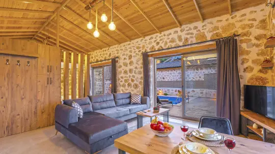 Taş bir mimariye sahip villa bünyesinde kapasiteye uygun mobilyalar, ihtiyacınız olan tüm araç-gereçleri barındıran modern mutfak ve 1 adet yatak odası mevcuttur. Konforunuz odaklı tasarlanan villanın yatak odasında klima ve jakuzi bulunmaktadır. Villanın korunaklı havuz terası ve müstakil bahçesinde yine kapasiteye uygun şezlong ve şemsiye, oturma alanı, yemek masası ve barbekü alanı mevcuttur.