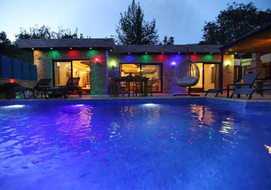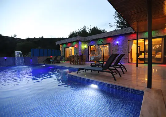 Villamızın iç tasarımı, misafirlerin konforu ve konforu adına en ince detaylarına kadar düşünülmüştür. Kapasiteye uygun mobilyalar, ihtiyacınız olan tüm araç-gereçleri barındıran Amerikan ürünleri, modern mutfak, iki yatak odası ve özel banyo/wc bulunmaktadır. Ayrıca villamızda yer alan jakuzi, langirt, salıncak, havuz sayesinde lüks içinde, rahat ve keyifli bir tatil geçirebilirsiniz.
