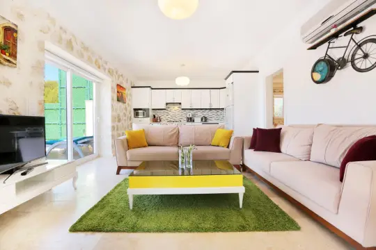 Taş mimariye sahip, doğa içerisinde yer alan villa bünyesinde kapasiteye uygun mobilyalar, ihtiyacınız olan tüm araç-gereçleri barındıran Amerikan tarzda mutfak ve 2 adet yatak odası mevcuttur.Konforunuz odaklı tasarlanan villanın yatak odalarında klima ve özel banyo/wc mevcuttur. Her iki yatak odası da havuz terası ve doğa manzarasına hakimdir. Ebeveyn suit yatak odasında günün yorgunluğunuzu atmanızı sağlayacak 1 adet jakuzisi de mevcuttur. Villanın korunaklı havuz terası ve müstakil bahçesinde kapasiteye uygun şezlong ve şemsiye, kamelyalı oturma alanı, yemek masası ve barbekü alanı mevcuttur.