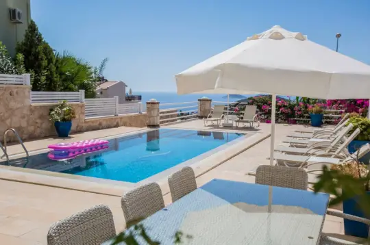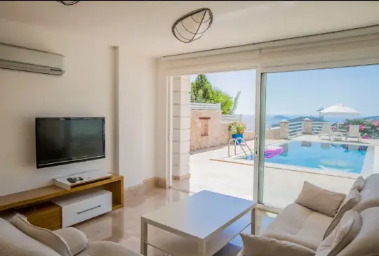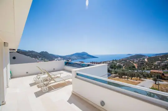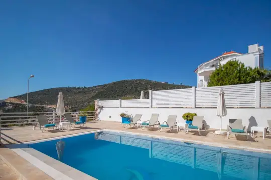 Kalkan Kışla mevkiinde bulunan villa, 4 yatak odasıyla 8 kişilik konaklama kapasitesi sunmaktadır. Geniş havuz ve bahçe alanına sahip olan villa kalabalık aile ve arkadaş grupları için uygun seçenekler arasındadır. Eşsiz deniz manzarasına sahip villamız da çatı katında bulunan jakuzi ile keyifli zaman geçirebilirsiniz.
