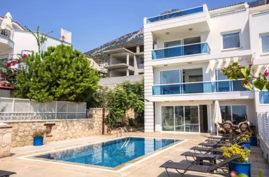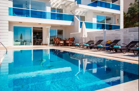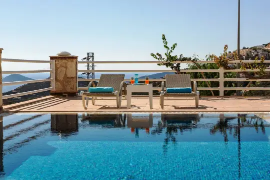 Kalkan Kışla mevkiinde bulunan villa, 4 yatak odasıyla 8 kişilik konaklama kapasitesi sunmaktadır. Geniş havuz ve bahçe alanına sahip olan villa kalabalık aile ve arkadaş grupları için uygun seçenekler arasındadır. Eşsiz deniz manzarasına sahip villamız da çatı katında bulunan jakuzi ile keyifli zaman geçirebilirsiniz.