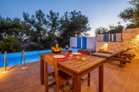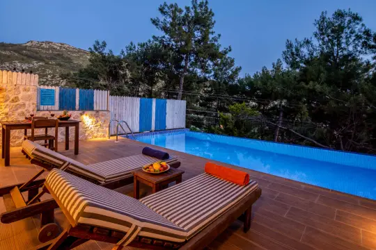 Kalkan İslamlar mevkiinde bulunan 1 yatak odalı ve 2 kişilik konaklama kapasitesine sahip bir balayı villasıdır. Doğa içerisinde korunaklı yapısı, şık tasarımı ve jakuzi konforu ile villa; muhafazakar çiftler ve balayı çiftleri için ideal bir villadır.