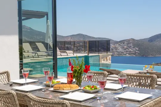 Kalkan Kalamar mevkiinde bulunan villa, 5 yatak odasıyla 10 kişilik konaklama kapasitesi sunmaktadır. Deniz manzarasına sahip olan villa, kalabalık aile ve arkadaş grupları için uygun seçenekler arasındadır.