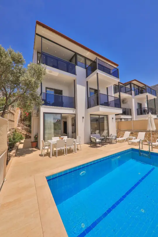Muhteşem manzaraya karşı, güneşlenip yüzebileceğiniz havuz terasında kapasiteye uygun şezlong takımı, oturma grubu ve barbekü alanı bulunan villa lüks ve donanımı bir arada sunmaktadır. Yine havuz terasına açılan konforlu oturma odası ve tam donanımlı açık mutfağı; bir yatak odasında çift kişilik yatak; iki yatak yatak odasında çift kişilik yatak , bir yatak odasında da iki tek kişilik yatak bulunmaktadır.
