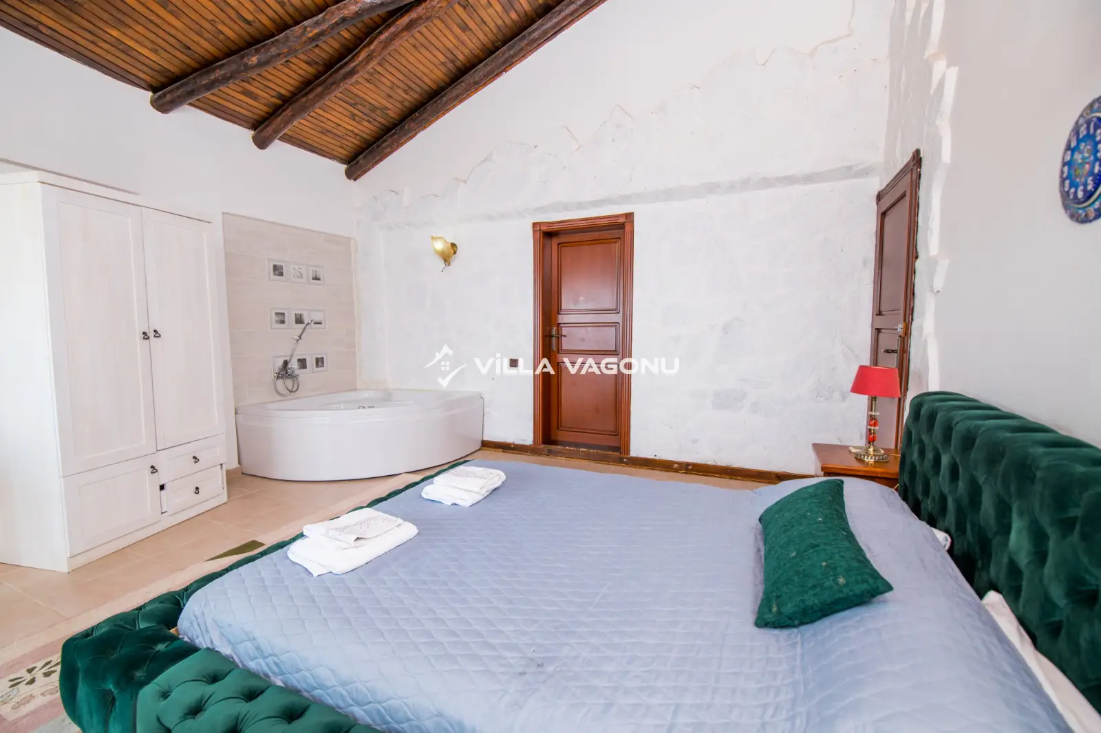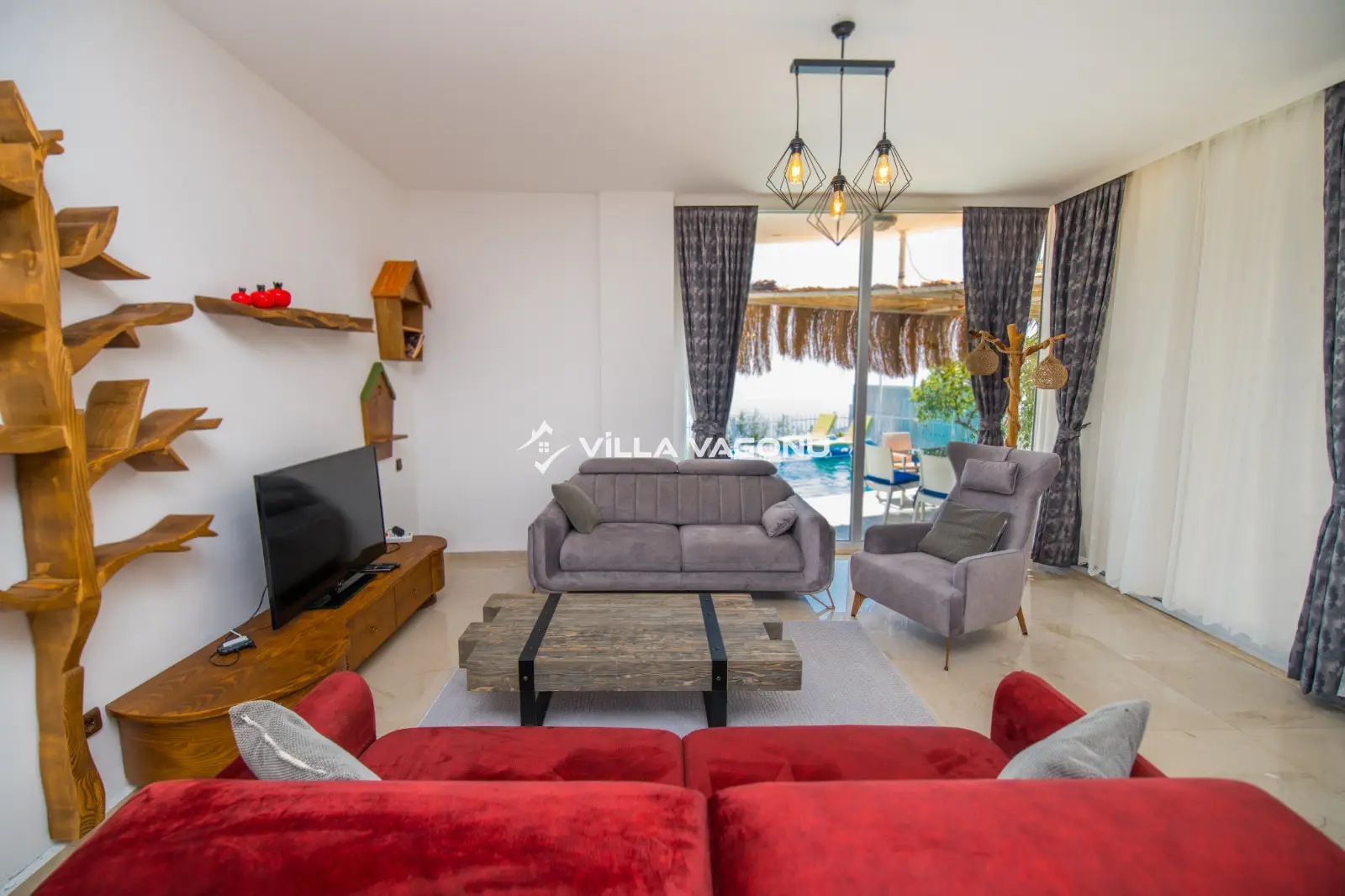 Lüks bir tasarıma sahip villa bünyesinde kapasiteye uygun mobilyalar, ihtiyacınız olan tüm araç-gereçleri barındıran Amerikan tarzda, modern mutfak ve 4 adet yatak odası mevcutur. Konforunuz odaklı tasarlanan villanın tüm yatak odalarında klima ve özel kullanım banyo/wc bulunmaktadır. Ebeveyn suit yatak odalarından birinde günün yorgunluğunu atmanızı ve tatilin keyfini çıkarmanızı sağlayacak 1 adet jakuzisi de bulunmaktadır. Villanın deniz manzarası gören havuz terasında yine kapasiteye uygun şezlong ve şemsiye, oturma alanı, yemek masası ve barbekü alanı bulunmaktadır.