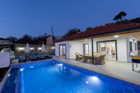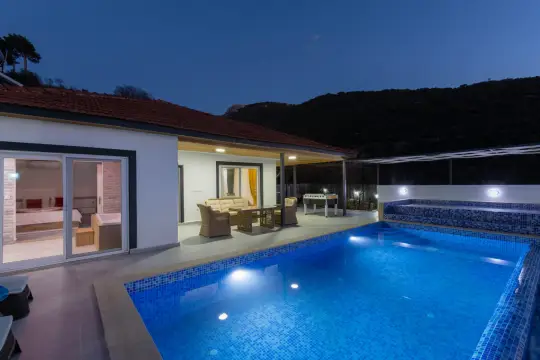 Doğa içerisinde korunaklı yapıya sahip villa bünyesinde kapasiteye uygun mobilyalar, ihtiyacınız olan tüm araç-gereçleri barındıran modern mutfak ve 2 adet yatak odası mevcuttur. Konforunuz odaklı tasarlanan villanın tüm yatak odalarında klima ve özel kullanım banyo/wc bulunmaktadır. Ebeveyn yatak odasında günün yorgunluğunu atmanızı ve tatilin keyfini çıkarmanızı sağlayacak 1 adet jakuzisi de mevcuttur. Villanın korunaklı havuz terası ve müstakil bahçesinde yine kapasiteye uygun şzlong ve şemsiye, oturma alanı, yemek masası ve barbekü alanı mevcuttur.