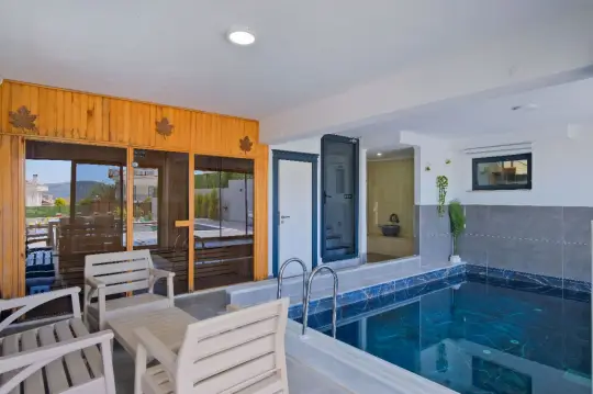 Göz dolduran genişliğe ve ferahlığa sahip villa bünyesinde kapasiteye uygun mobilyalar, ihtiyacınız olan tüm araç-gereçleri barındıran modern mutfak ve 4 adet yatak odası mevcuttur. Konforunuz tasarlanmış villanın tüm yatakları klima ve özel kullanım banyo/wc'si mevcuttur. Villanın ebeveyn yatak odalarından 2'sinde TV ve günün yorgunluğunu atarken, tatilin keyfini çıkarmanızı sağlayacak 1'er adet jakuzisi de bulunmaktadır. Aynı zamanda villa bünyesinde ısıtma sistemi kapalı havuz ve sauna da mevcuttur. Villanın özel havuz terası ve müstakil aralığı yine kapasiteye uygun yayın ve şemsiye, oturma alanı, yemek masası ve barbekü alanı bulunmaktadır.