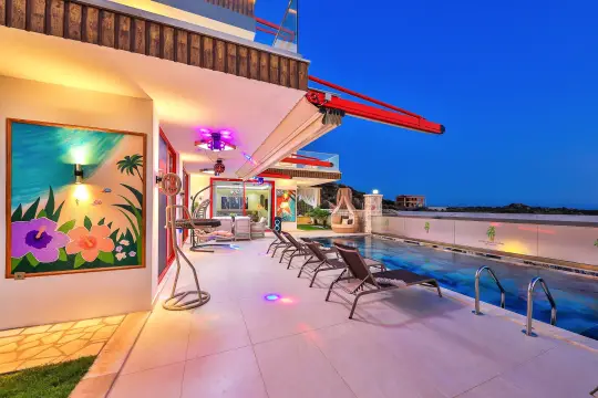 Oldukça ferah ve geniş bahçe alanında kapasiteye uygun şezlong takımı, oturma grubu ve barbekü alanına sahiptir. Havuz terasına açılan zevkle döşenmiş konforlu oturma odası ve tam donanımlı mutfağı, iki yatak odasında çift kişilik yatak, ebeveyn banyosu ve jakuzi; üçüncü yatak odasında da iki tek kişilik yatak ve ebeveyn banyosu bulunmaktadır. İç mekan yapısı ve donanımları da en az dış mekan kadar ferah, modern ve konforunuz ön planda tutularak oluşturulmuştur.Villamızın teras katında misafirlerimizin keyifli vakit geçirmesi için bilardo,koşu bandı,jakuzi,projeksiyon cihazı bulunmaktadır. Havuz keyfinizi daha eğlenceli hale getirmek için havuz başında disko ışık sistemi ve müzik sistemimiz bulunmaktadır.
