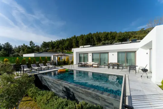 Tatlı ve hoş dekorasyonuyla sizleri karşılayan tatil evinin, havuz terasında kapasiteye uygun oturma alanı, şezlong takımı, barbekü; havuz terasına açılan konforlu oturma odası, ihtiyaçlarınızı karşılayacak donanımlı mutfağı bulunmaktadır. Birinci yatak odasında çift kişilik yatak, ebeveyn banyosu, jakuzi; ikinci yatak odasında çift kişilik yatak, ebeveyn banyosu, jakuzi; üçüncü yatak odasında iki adet tek kişilik yatak ve banyo mevcuttur.