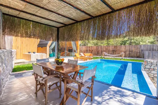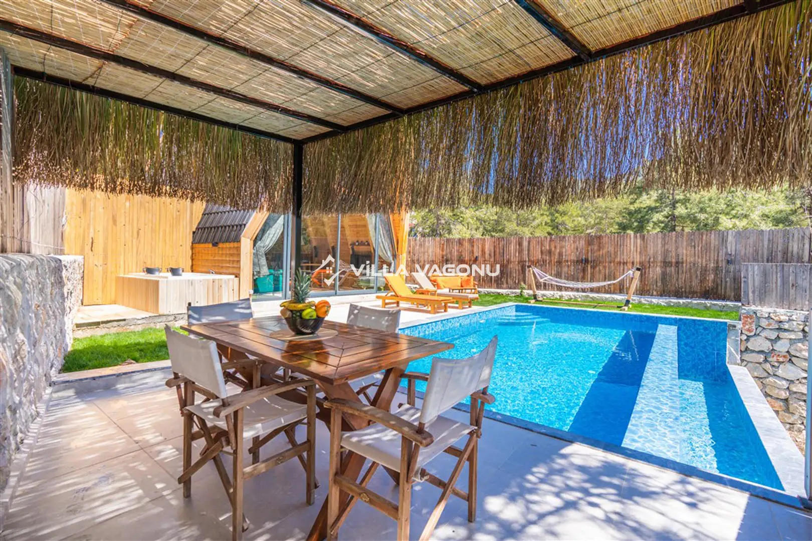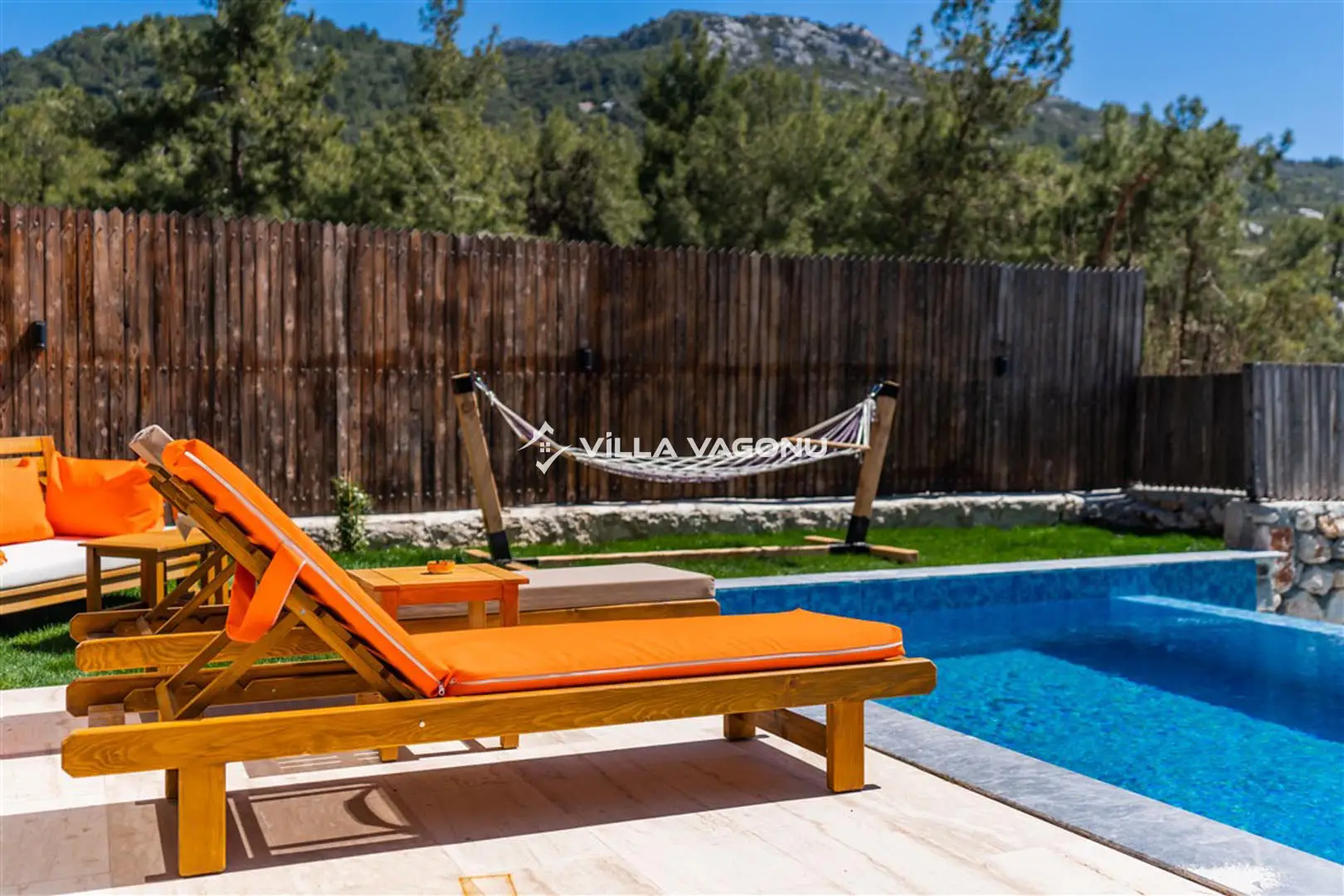 Villamızın özel havuzunda doyasıya yüzebilir ve güneşin keyfini çıkarabilirsiniz. Bahçe alanında kapasiteye uygun şezlong takımı, oturma grubu ve barbekü , jakuzi bulunmaktadır. Havuz terasına açılan konforlu oturma odası ve tam donanımlı açık mutfak, tatilinizi daha da keyifli hale getirecek. Villamızın birinci yatak odasında çift kişilik yatak, ebeveyn banyosu yer almaktadır.