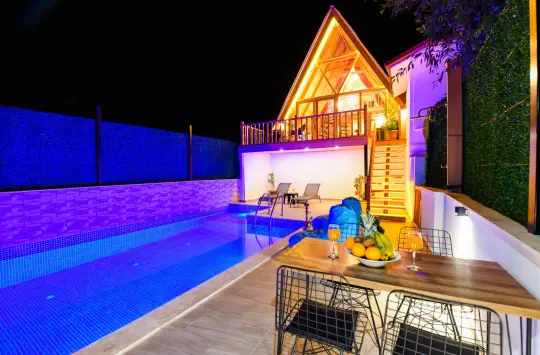 Ahşap mimariye sahip, bungalov yapıdaki villa bünyesinde kapasiteye uygun mobilyalar, ihtiyacınız olan tüm araç-gereçleri barındıran Amerikan tarzda, modern mutfak ve 1 adet yatak odası mevcuttur. Konforunuz odaklı tasarlanan villanın yatak odasında klima da mevcuttur. Villanın korunaklı havuz terası ve müstakil bahçesinde yine kapasiteye uygun şezlong ve şemsiye, oturma alanı, yemek masası ve barbekü alanı bulunmaktadır.