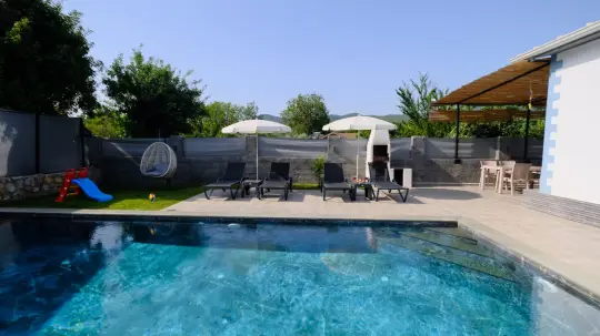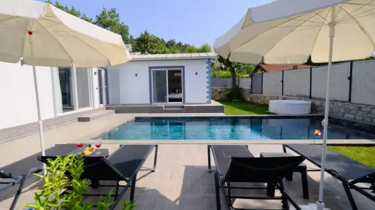 Çekirdek aileler ve arkadaş grupları ve Balayı Çiftleri için oldukça idealdir. Oldukça şık ve modern bir şekilde döşenmiş olan villamızda misafirlerimiz için her şey düşünülmüştür. Havuz terasında bulunan şezlonglarda güneşlenebilir, bahçe masasında muhteşem yemekler yiyebilir, salıncakta sallanıp keyifli dakikalar geçirebilirsiniz.