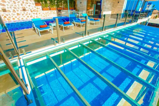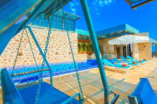 Muhteşem manzaraya karşı, güneşlenip yüzebileceğiniz havuz terasında kapasiteye uygun şezlong takımı, oturma grubu ve barbekü alanı bulunan villanın, yine havuz terasına açılan konforlu oturma odası ve tam donanımlı açık mutfağı; bir yatak odasında çift kişilik yatak ebeveyn banyosu ve jakuzi; ikinci yatak odasında çift kişilik yatak ve ebeveny banyosu; üçüncü yatak odasında iki tek kişilik yatak ve ebeveyn banyosu bulunmaktadır. Villanın içinde Türk hamamı sayesinde tüm yorgunluklarınızdan kurtulacaksınız.