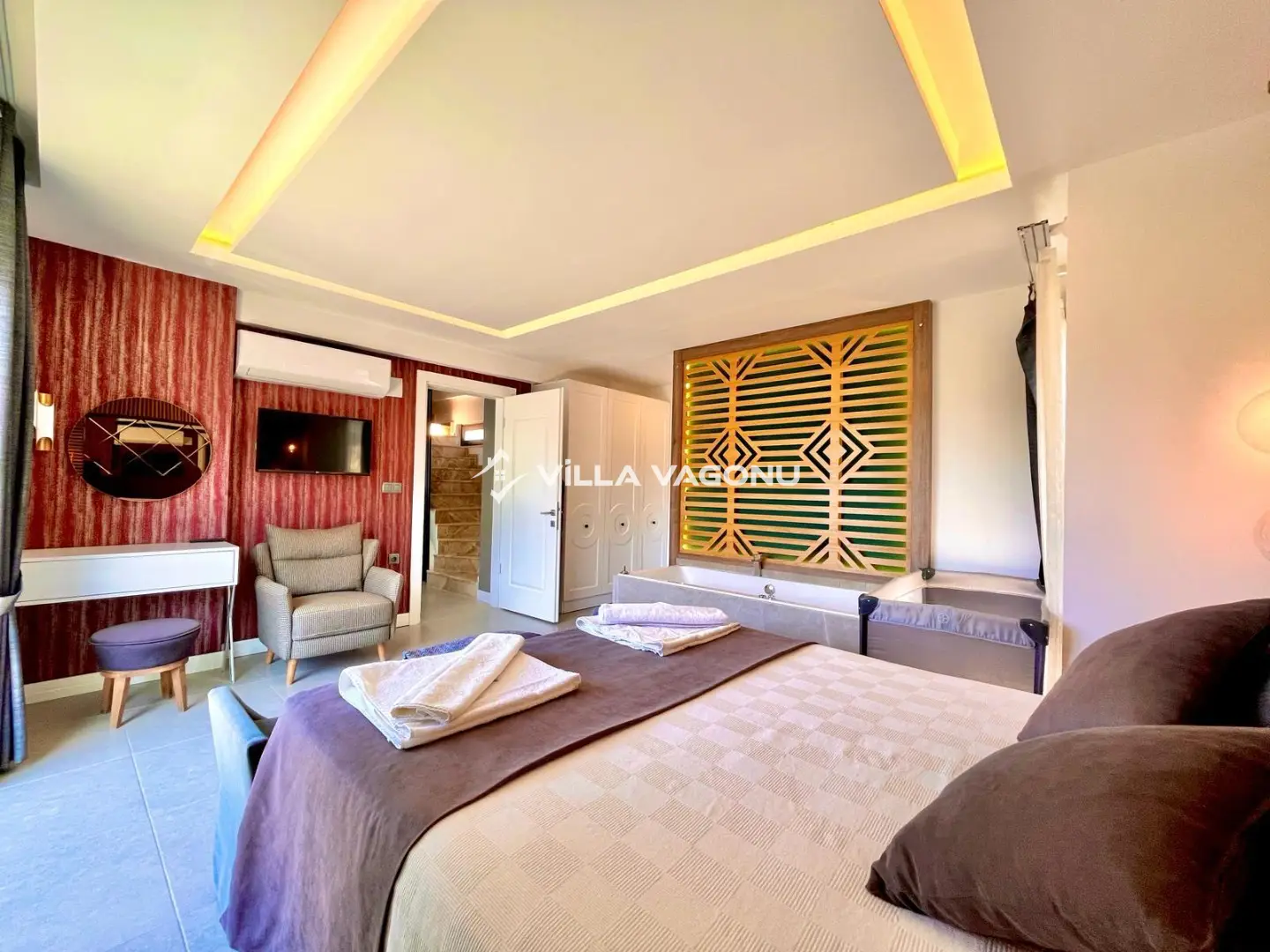 Villamızda hem açık hem de kapalı havuz bulunmakta olup, yılın her döneminde keyifli bir tatil imkânı sunmaktadır. Sauna ve hamam gibi özel olanaklar sayesinde günün yorgunluğunu atabilir, tatiliniz boyunca kendinizi yenilenmiş hissedebilirsiniz. Villamızın birinci yatak odasında; çift kişilik yatak,jakuzi,ebeveyn banyosu ikinci yatak odasında; çift kişilik yatak,jakuzi,ebeveyn banyosu üçüncü yatak odasında; çift kişilik yatak banyo wc, dördüncü yatak odasında;çift kişilik yatak banyo wc yer almaktadır.