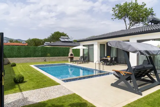 Taş mimariye sahip villa bünyesinde kapasiteye uygun mobilyalar, ihtiyacınız olan tüm araç-gereçleri barındıran Amerikan tarzda, modern mutfak ve 2 adet yatak odası mevcuttur. Konforunuz odaklı tasarlanan villanın tüm yatak odalarında özel kullanım banyo/wc bulunmaktadır. Villanın tam korunaklı havuz terası ve müstakil bahçesinde yine kapasiteye uygun şezlong ve şemsiye, oturma alanı, yemek masası ve barbekü alanı bulunmaktadır.