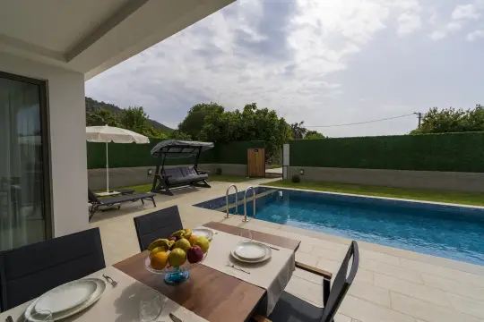 Taş mimariye sahip villa bünyesinde kapasiteye uygun mobilyalar, ihtiyacınız olan tüm araç-gereçleri barındıran Amerikan tarzda, modern mutfak ve 2 adet yatak odası mevcuttur. Konforunuz odaklı tasarlanan villanın tüm yatak odalarında özel kullanım banyo/wc bulunmaktadır. Villanın tam korunaklı havuz terası ve müstakil bahçesinde yine kapasiteye uygun şezlong ve şemsiye, oturma alanı, yemek masası ve barbekü alanı bulunmaktadır.