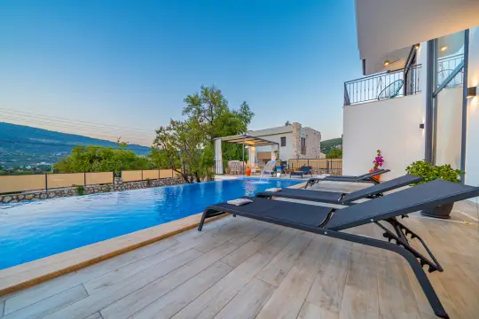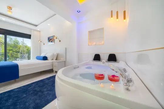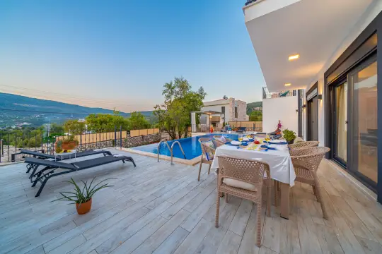 Muhteşem doğa manzaraya karşı, güneşlenip yüzebileceğiniz havuz terasında kapasiteye uygun şezlong takımı, oturma grubu ve barbekü alanı bulunan villa lüks ve donanımı bir arada sunmaktadır. Yine havuz terasına açılan konforlu oturma odası ve tam donanımlı açık mutfağı; bir yatak odasında çift kişilik yatak; iki yatak odasında çift kişilik yatak , bir yatak odasında da iki tek kişilik yatak bulunmaktadır.