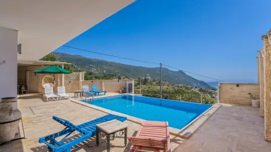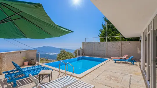 Kalkan Üzümlü mevkiinde yer alan villa, sizlere huzurlu bir konaklama deneyimi sunuyor. 4 yatak odasıyla 7 kişilik konaklama kapasitesine sahip olan villamız,geniş aileler için ideal bir tercihtir. Ferah iç mekanları ve zarif tasarımı ile göz dolduran villa, deniz manzarasına hakimdir.