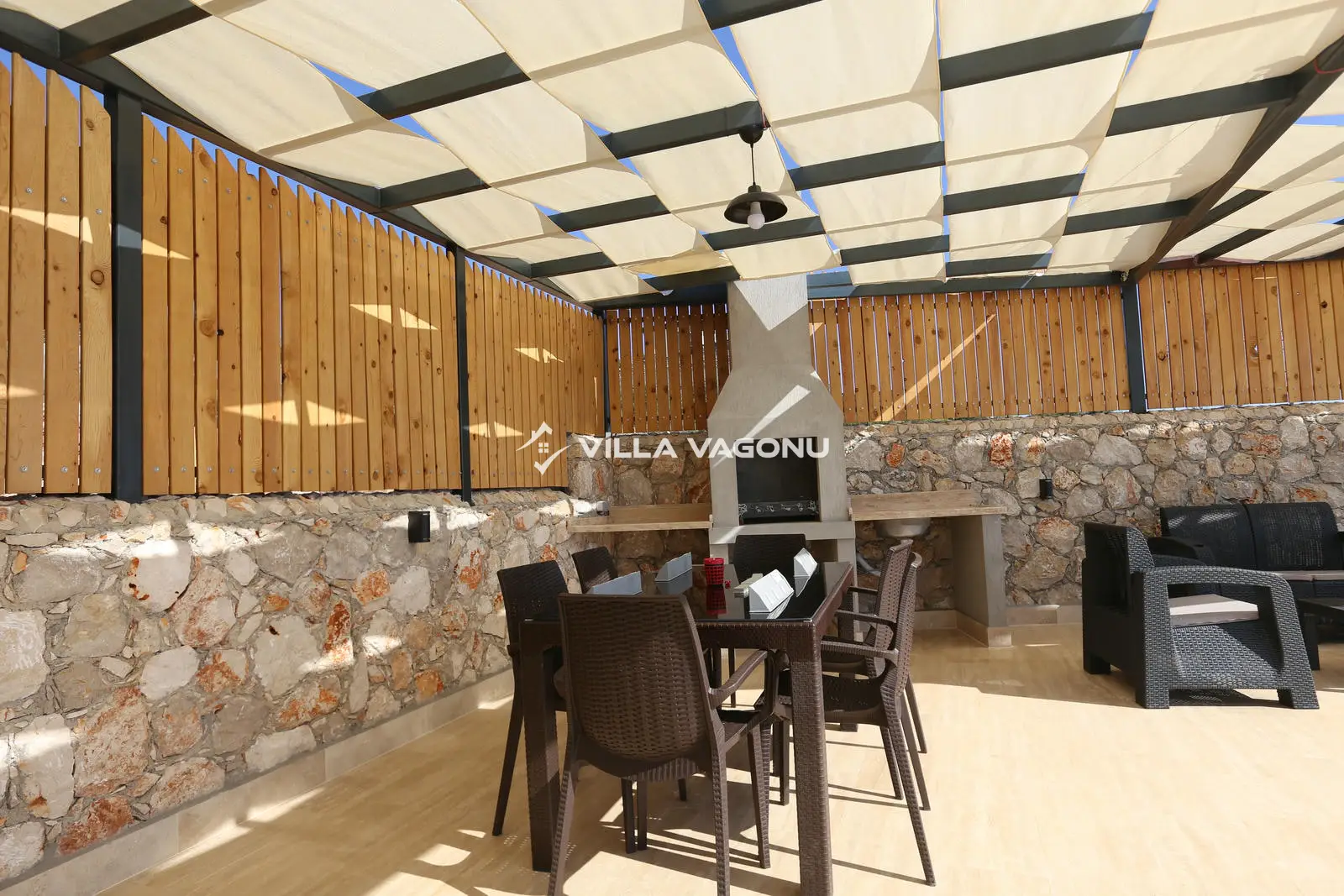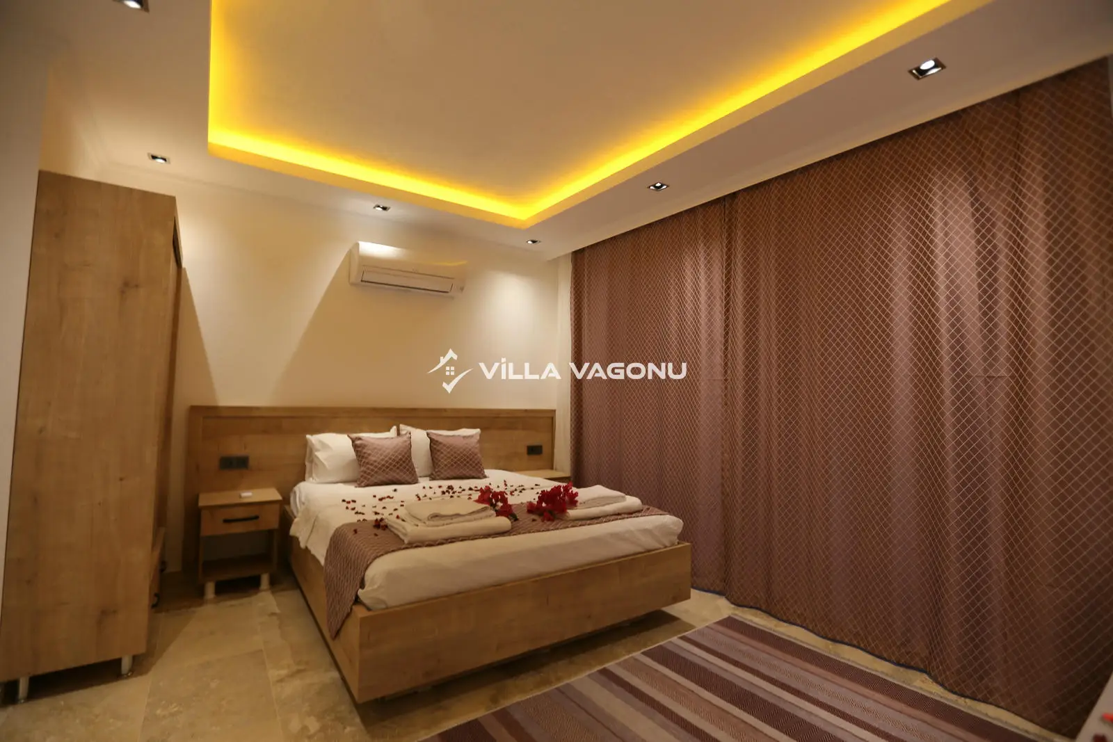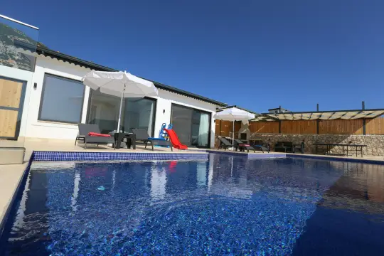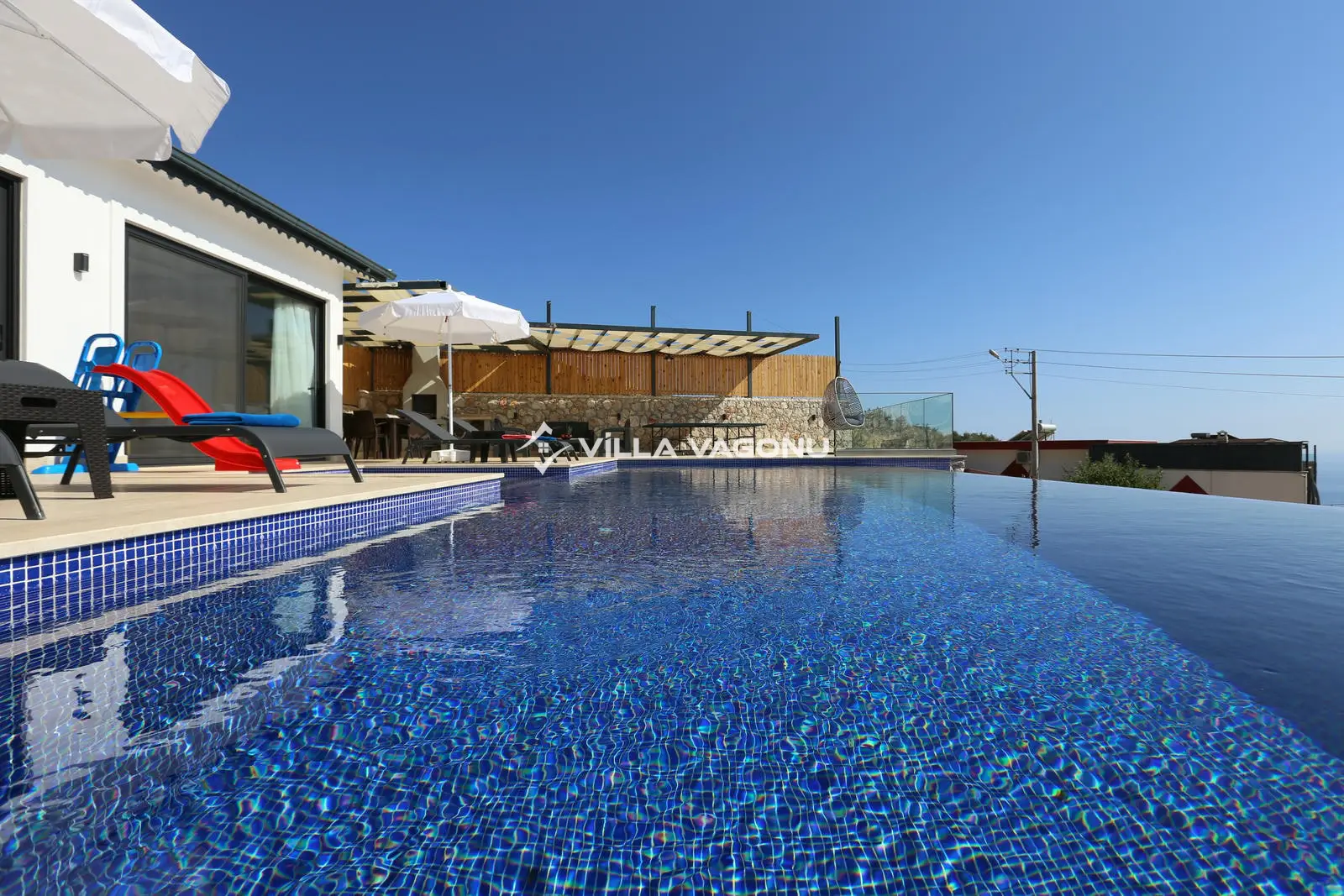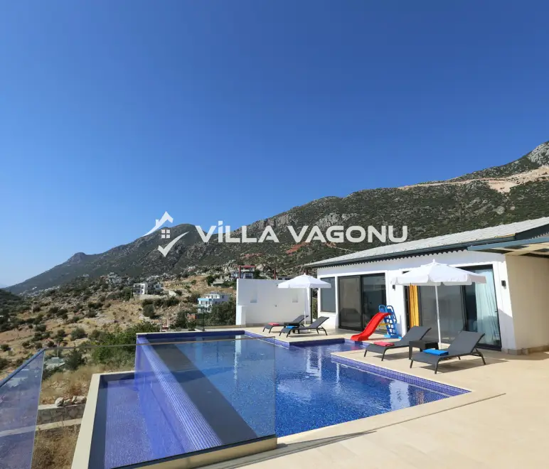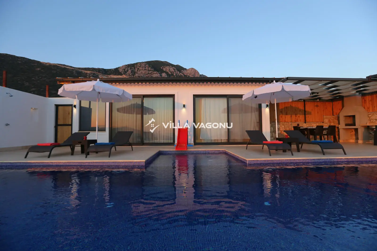Kalkan Kördere mevkiinde yer alan deniz manzaralı villa, sizlere huzurlu bir konaklama deneyimi sunuyor. 2 yatak odasıyla 4 kişilik konaklama kapasitesine sahip olan villamız, balayı çiftleri ve çekirdek aileler için ideal bir tercihtir. Ferah iç mekanları ve zarif tasarımı ile göz dolduran villa, doğa manzarasına hakimdir.