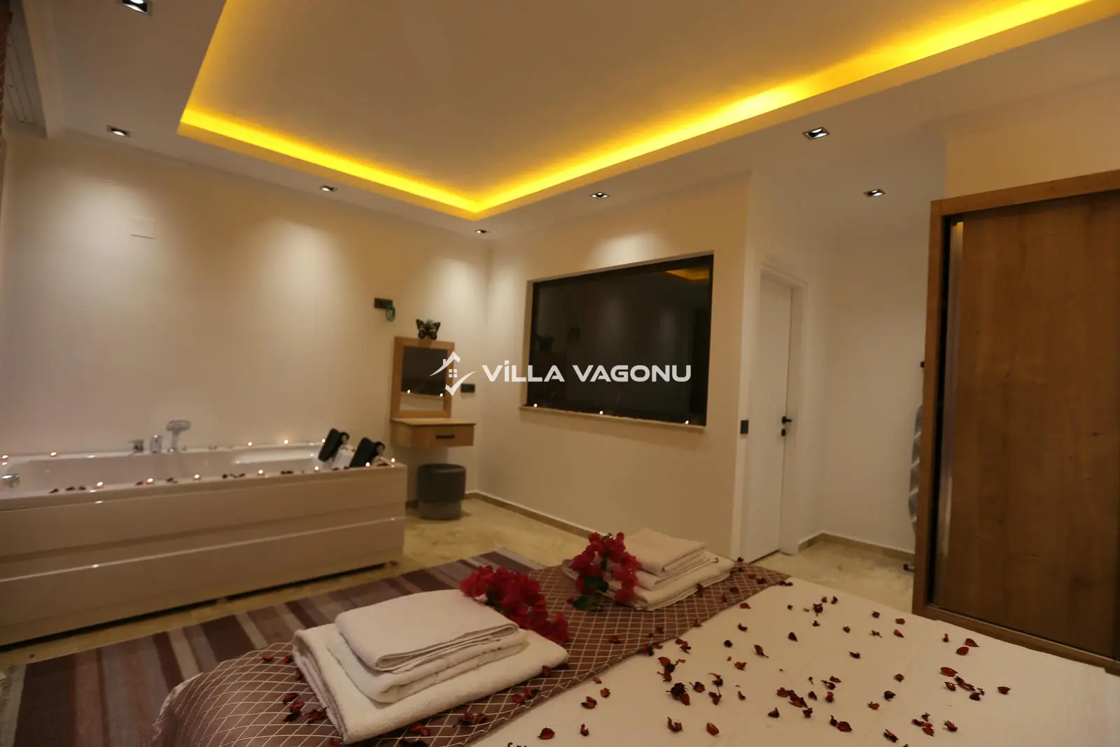 Villamızın özel havuzunda doyasıya yüzebilir ve güneşin keyfini çıkarabilirsiniz. Bahçe alanında kapasiteye uygun şezlong takımı, oturma grubu, salıncak , masa tenisi ve barbekü bulunmaktadır. Havuz terasına açılan konforlu oturma odası ve tam donanımlı açık mutfak, tatilinizi daha da keyifli hale getirecek. Villamızın birinci yatak odasında çift kişilik yatak, ebeveyn banyosu ve jakuzi; ikinci yatak odasında ise iki adet tek kişilik yatak ve banyo yer almaktadır.