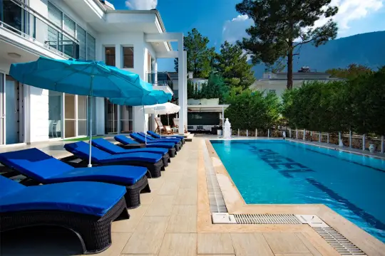 Fethiye, Ölüdeniz/Ovacık mevkiinde bulunan 4 yatak odalı ve 8 kişilik konaklama birimine sahip lüks bir villadır. Göz dolduran genişliğe sahip, doğa manzaralı villa geniş aileler ve kalabalık gruplar için uygun bir villadır.