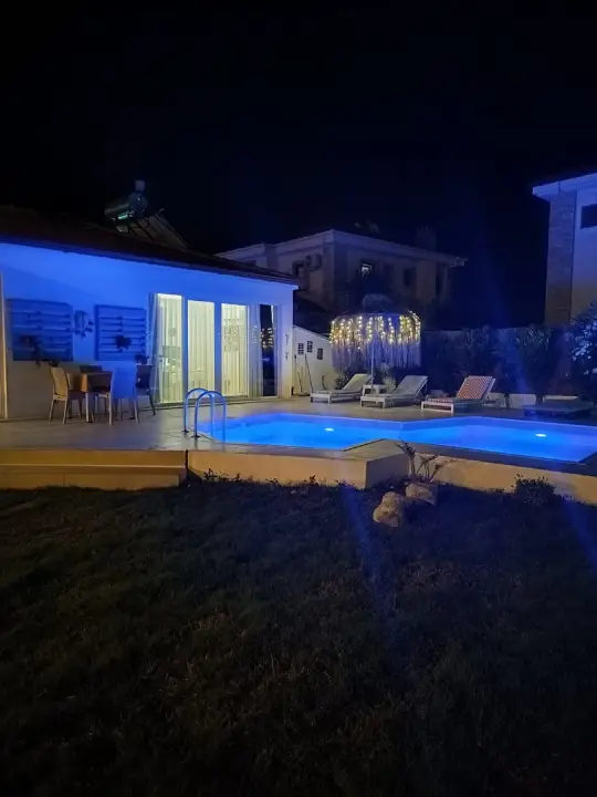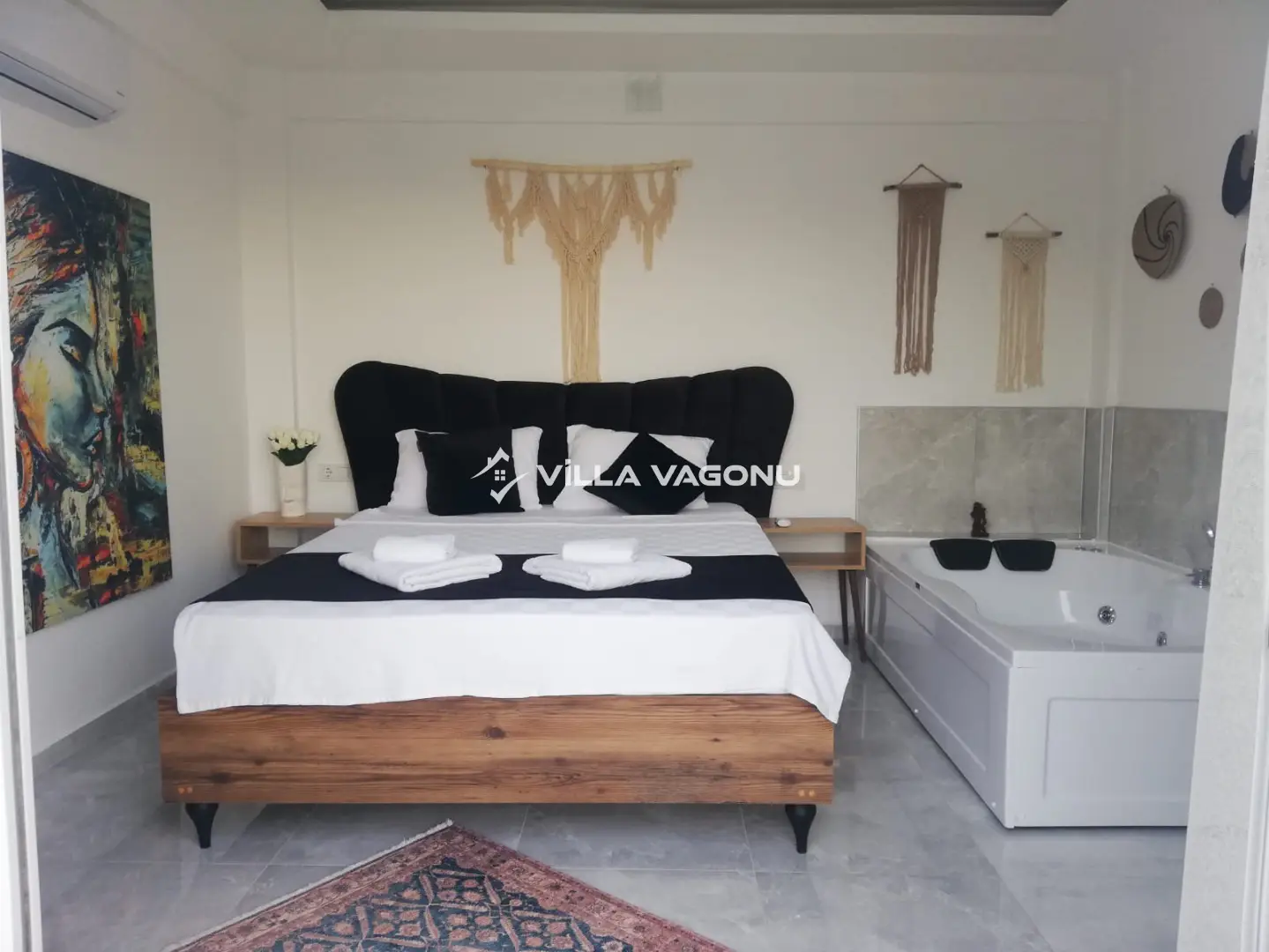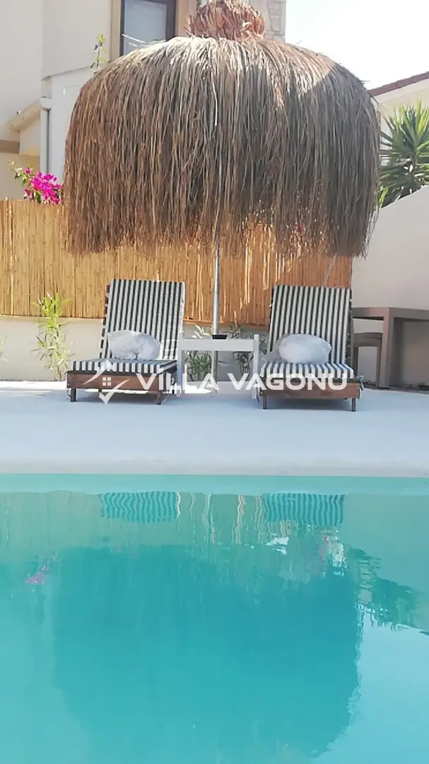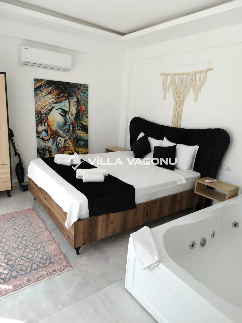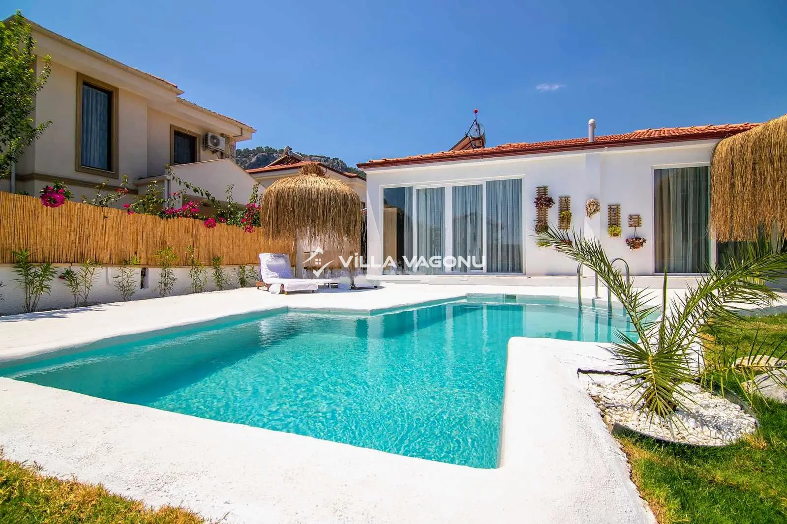 Villamızın özel havuzunda doyasıya yüzebilir ve güneşin keyfini çıkarabilirsiniz. Bahçe alanında kapasiteye uygun şezlong takımı, oturma grubu ve barbekü bulunmaktadır. Havuz terasına açılan konforlu oturma odası ve tam donanımlı açık mutfak, tatilinizi daha da keyifli hale getirecek. Villamızın yatak odasında çift kişilik yatak, ebeveyn banyosu ve jakuzi yer almaktadır.